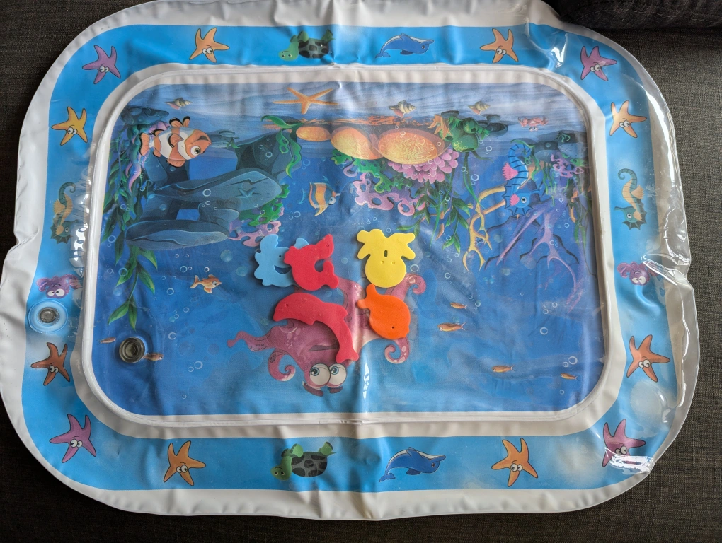 This is a gently used inflatable water play mat for babies. It features a colourful underwater theme with sea creatures and floating shapes. Perfect for tummy time and sensory development!