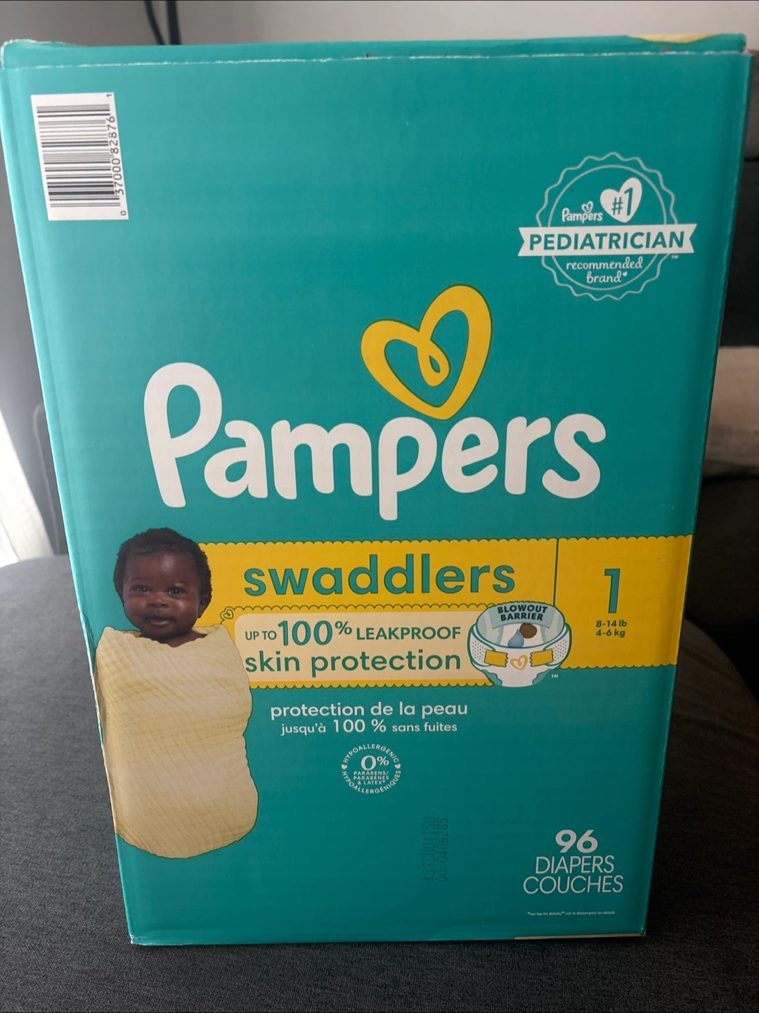 Selling a box of Pampers Swaddlers diapers, size 1. There are 96 diapers in the box, perfect for little ones weighing 8-14 lbs (4-6 kg).
