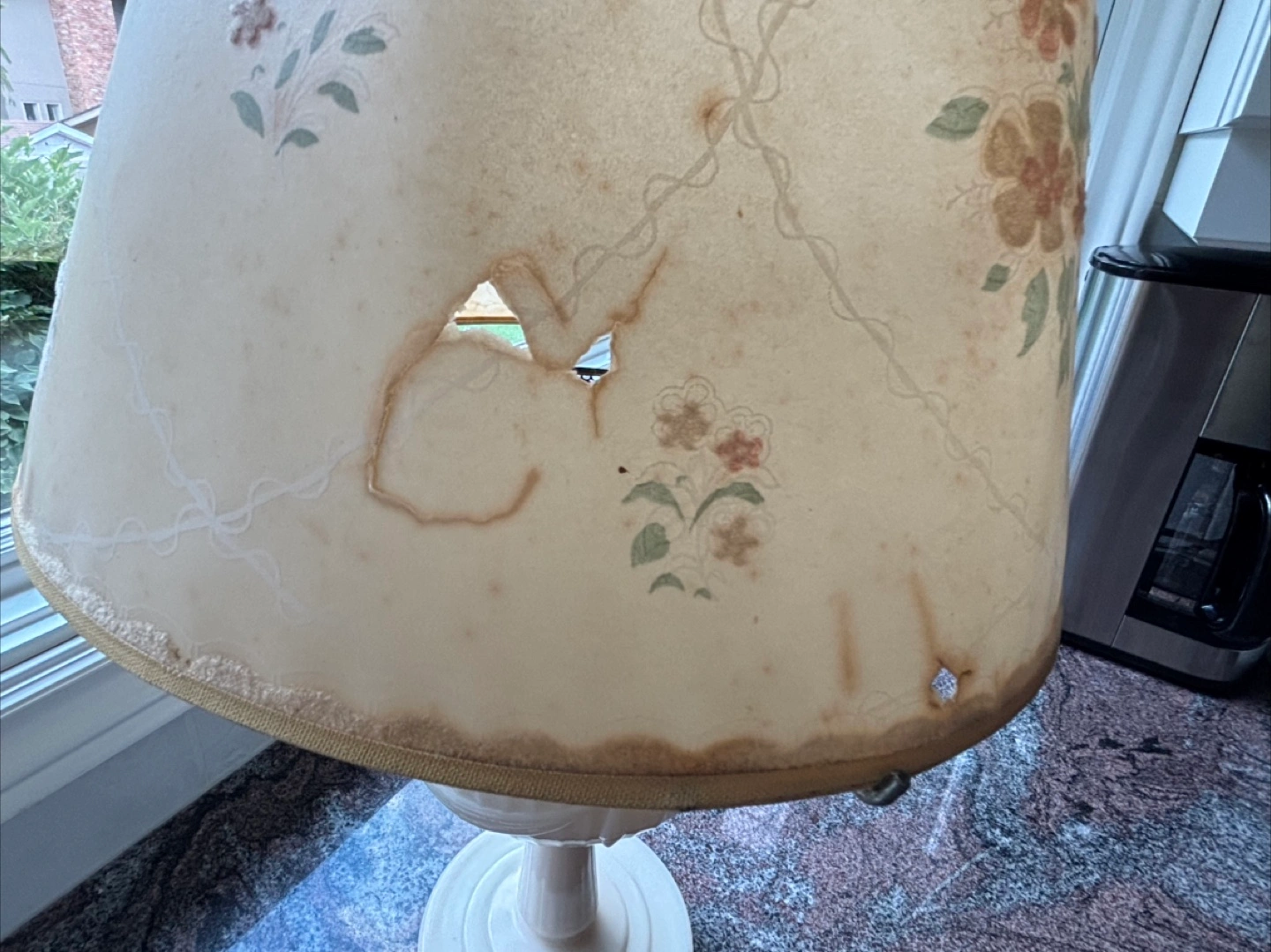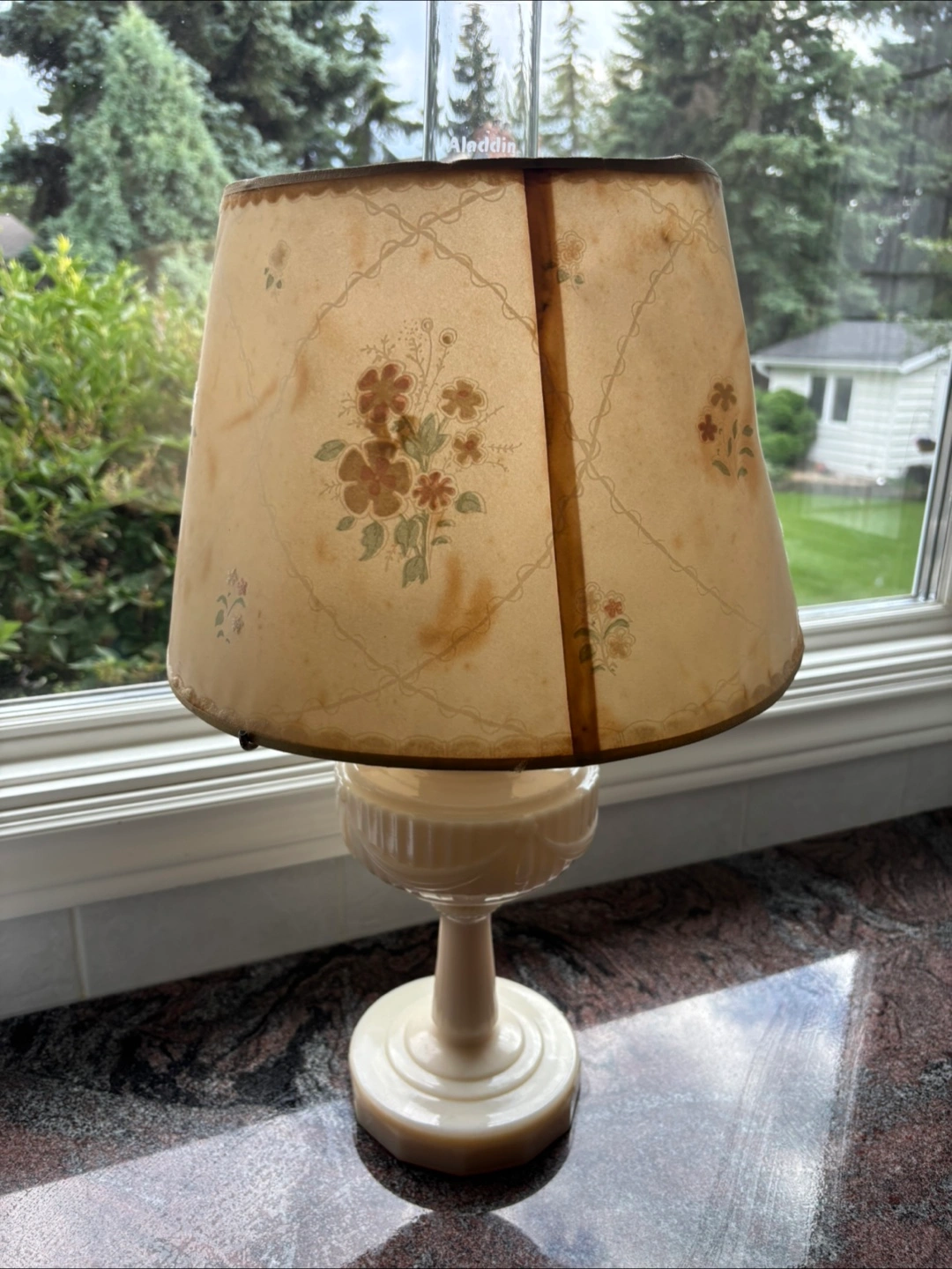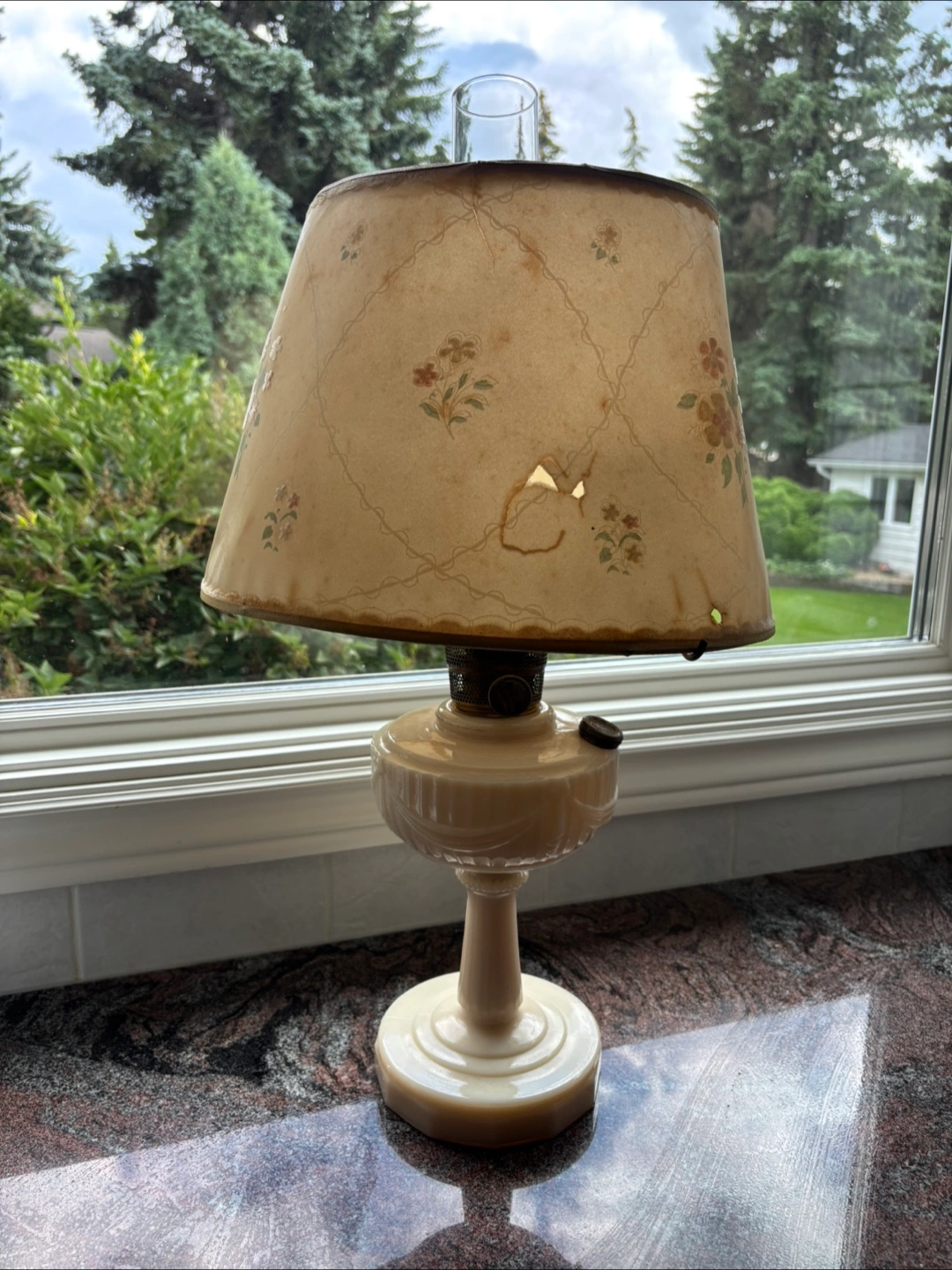 Selling a vintage table oil lamp with a floral design. The lampshade has some wear and tear, including some holes and staining. It could be a great project for someone who enjoys restoring vintage items!