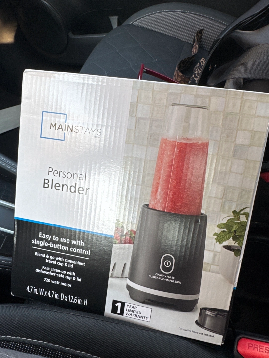 Selling a brand new Mainstays personal blender! It's still in its original box and has never been used. It's easy to use with single-button control and comes with a convenient travel cup and lid. Plus, it's easy to clean up with a dishwasher-safe cup and lid. The blender has a 220-watt motor and measures 4.7 in. W x 4.7 in. D x 12.6 in. H