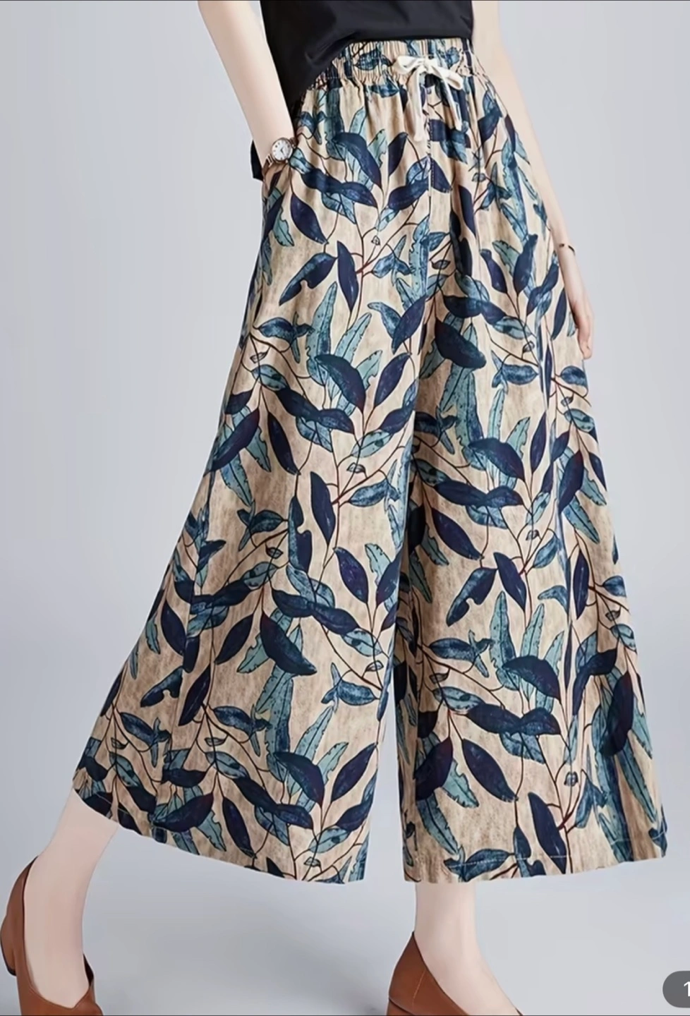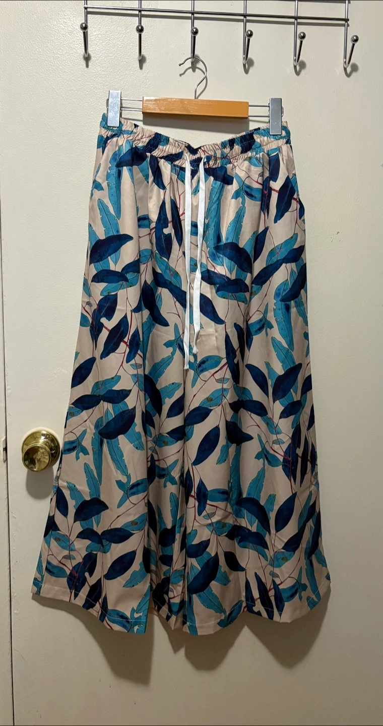 This lightweight wide-leg pants are perfect for a breezy, comfy fit. The pattern features lovely blue and beige leaves, making them a stylish addition to any wardrobe.
