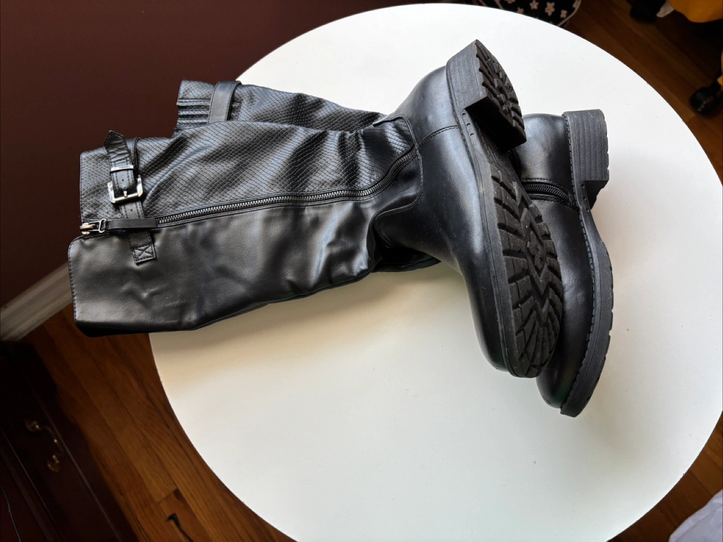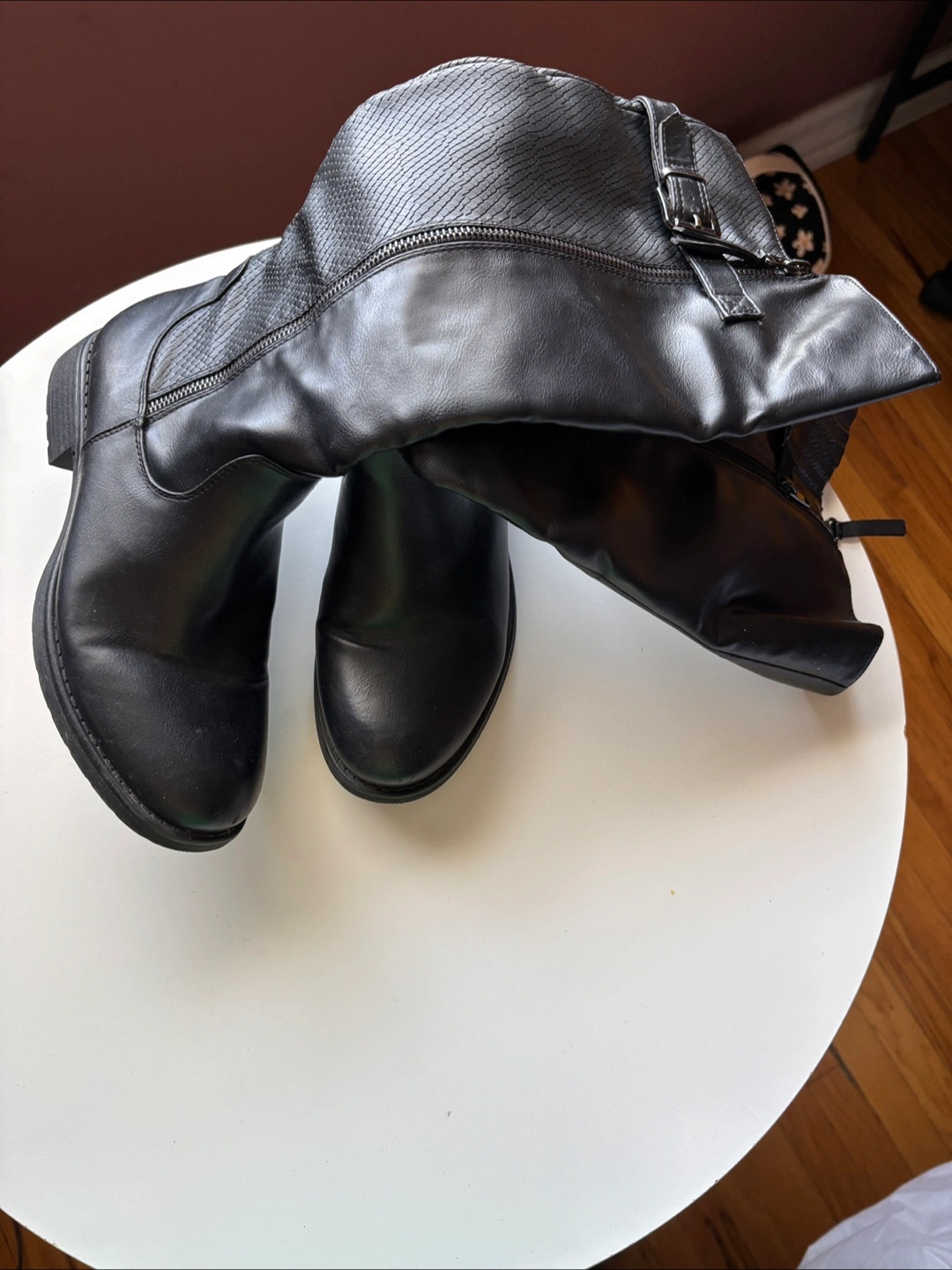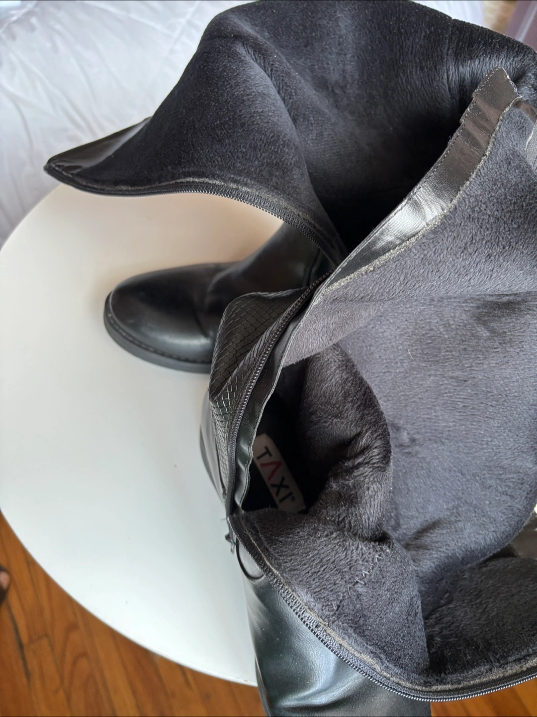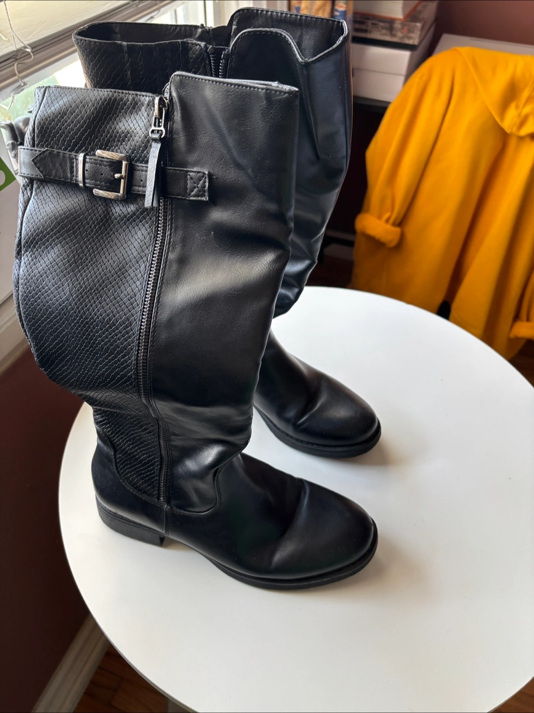 Selling a pair of Taxi brand knee-high boots in black. These boots feature a stylish design with a buckle and zipper detail. They are in excellent condition and ready for a new home!