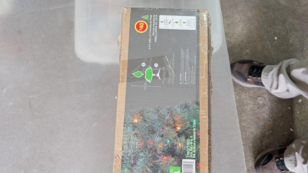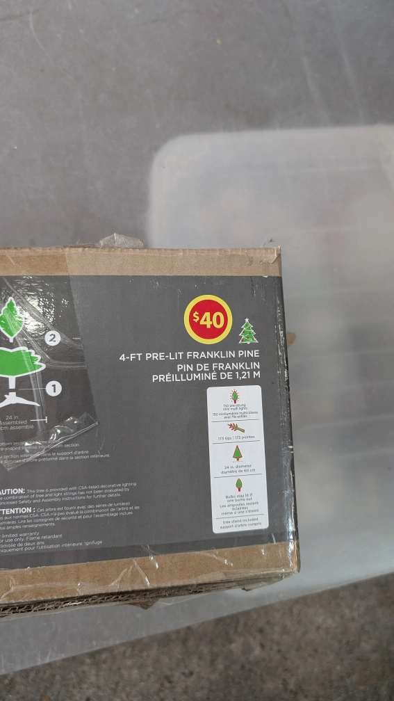 Selling a 4-ft pre-lit Franklin Pine tree! It's 1.21 m tall and has a 24-inch diameter. The tree comes in its original packaging. asking 10.00 O.B.O. FCFS