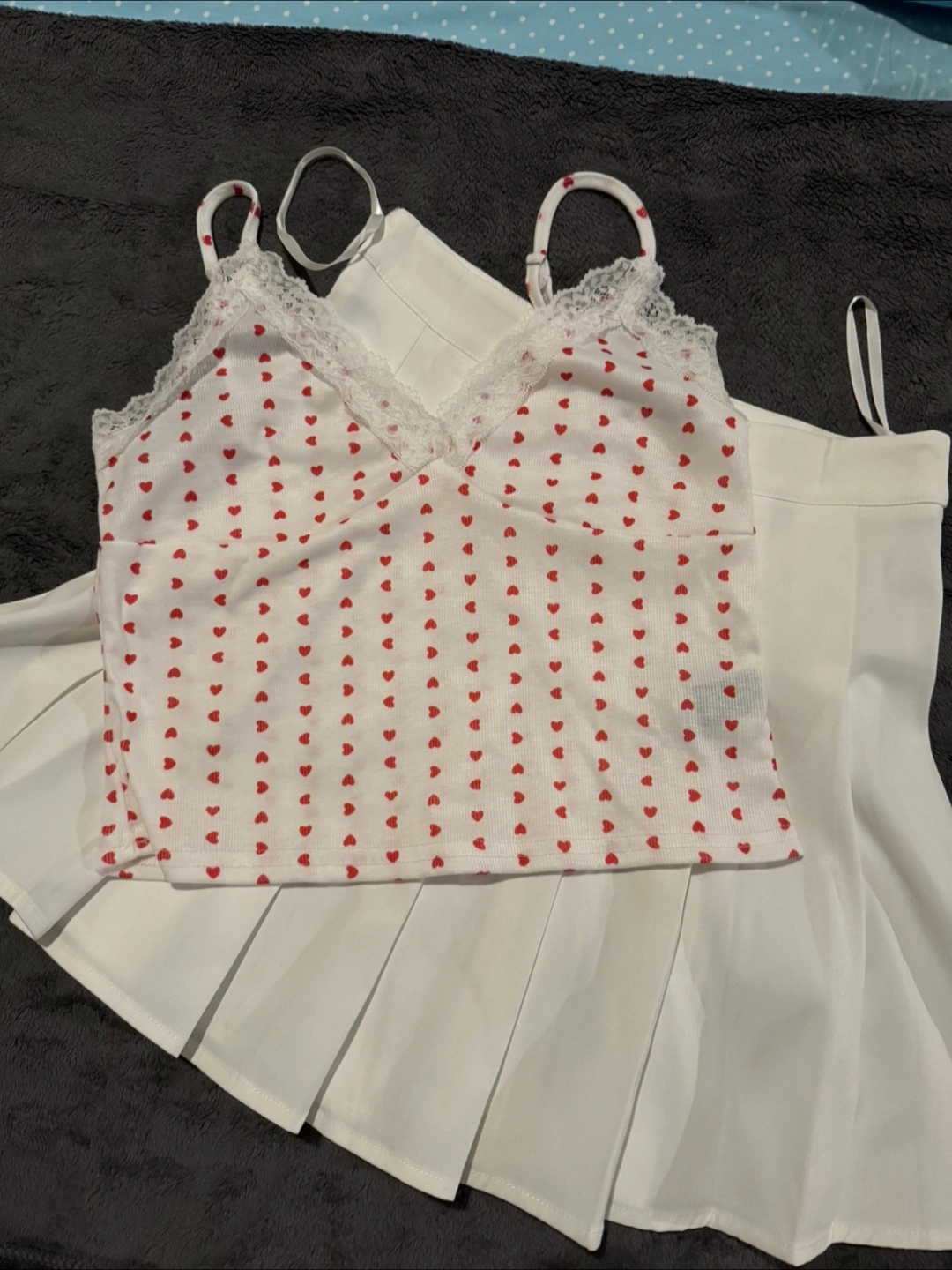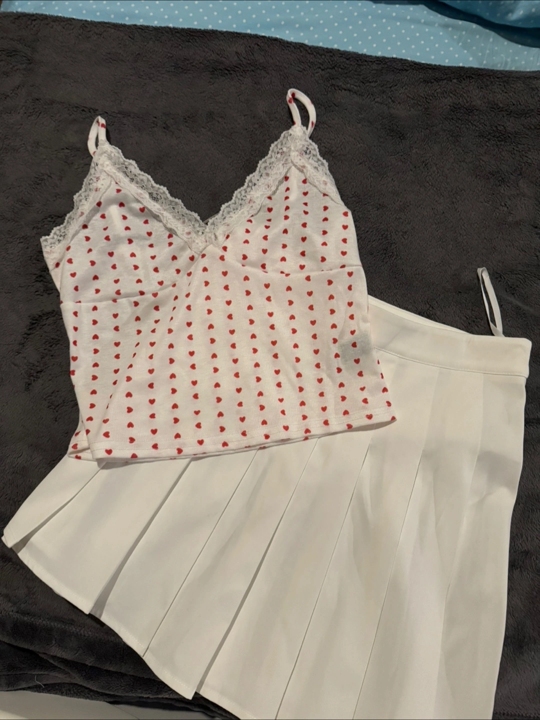 Cute white skirt and cami set! The cami has a sweet red heart pattern and lace trim, while the skirt is a classic pleated style. Never worn. Open for trade
