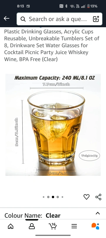Five clear acrylic drinking glasses! These are reusable and unbreakable, perfect for picnics, parties, or everyday use. They're BPA free and great for water, juice, whiskey, or wine. Each glass has a maximum capacity of 240ml/8.1oz and measures 9cm/3.5inch in height and 7.7cm/3inch in diameter.