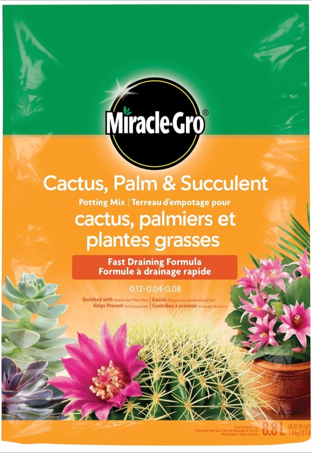 I'm selling a bag of Miracle-Gro Cactus, Palm & Succulent potting mix. It's a fast-draining formula enriched with Miracle-Gro plant food to help prevent soil compaction. Perfect for your cacti, palms, and succulents!
