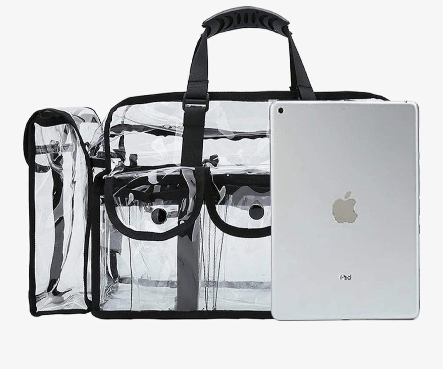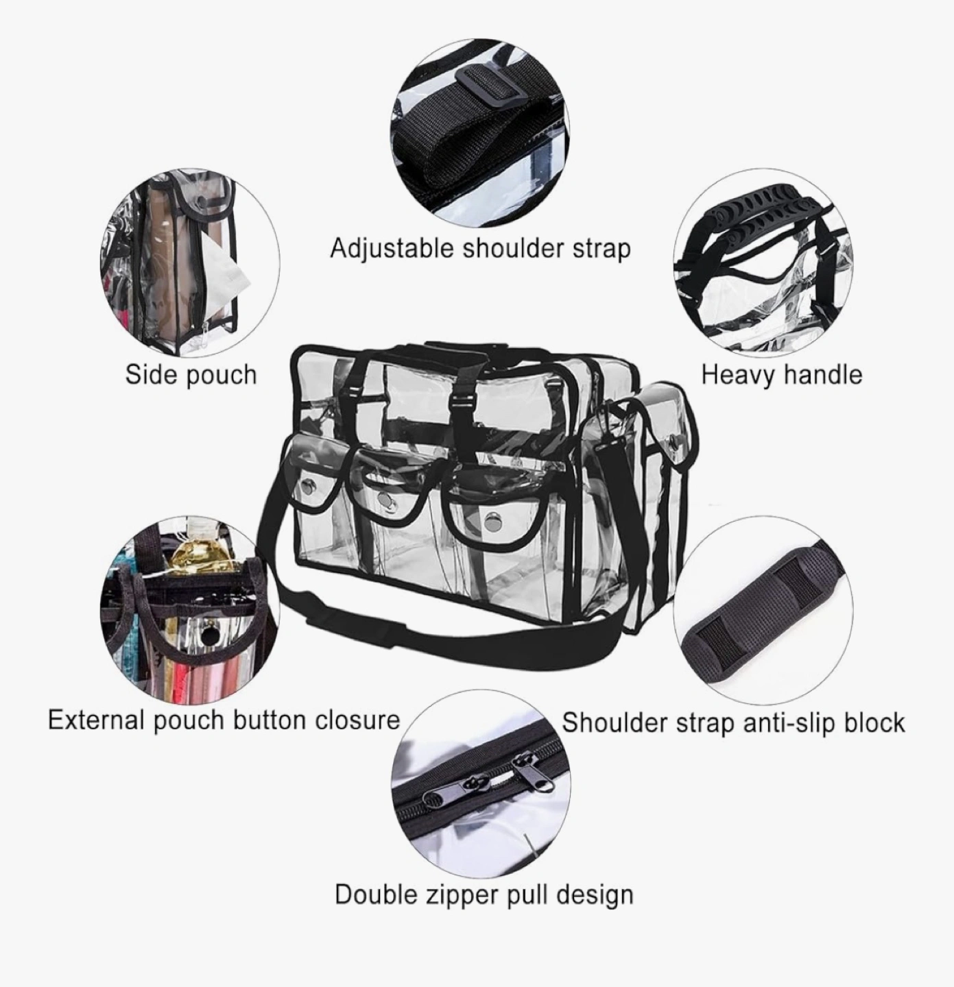 Looking to keep your makeup and cosmetics neatly organized? This clear makeup bag is just what you need! It features multiple compartments and side pockets, making it easy to store and access all your essentials. The bag also comes with an adjustable shoulder strap and a heavy-duty handle for comfortable carrying. Dimensions are approximately 49 cm (19.3 in) in length, 29 cm (11.4 in) in height, and 16 cm (6.3 in) in width