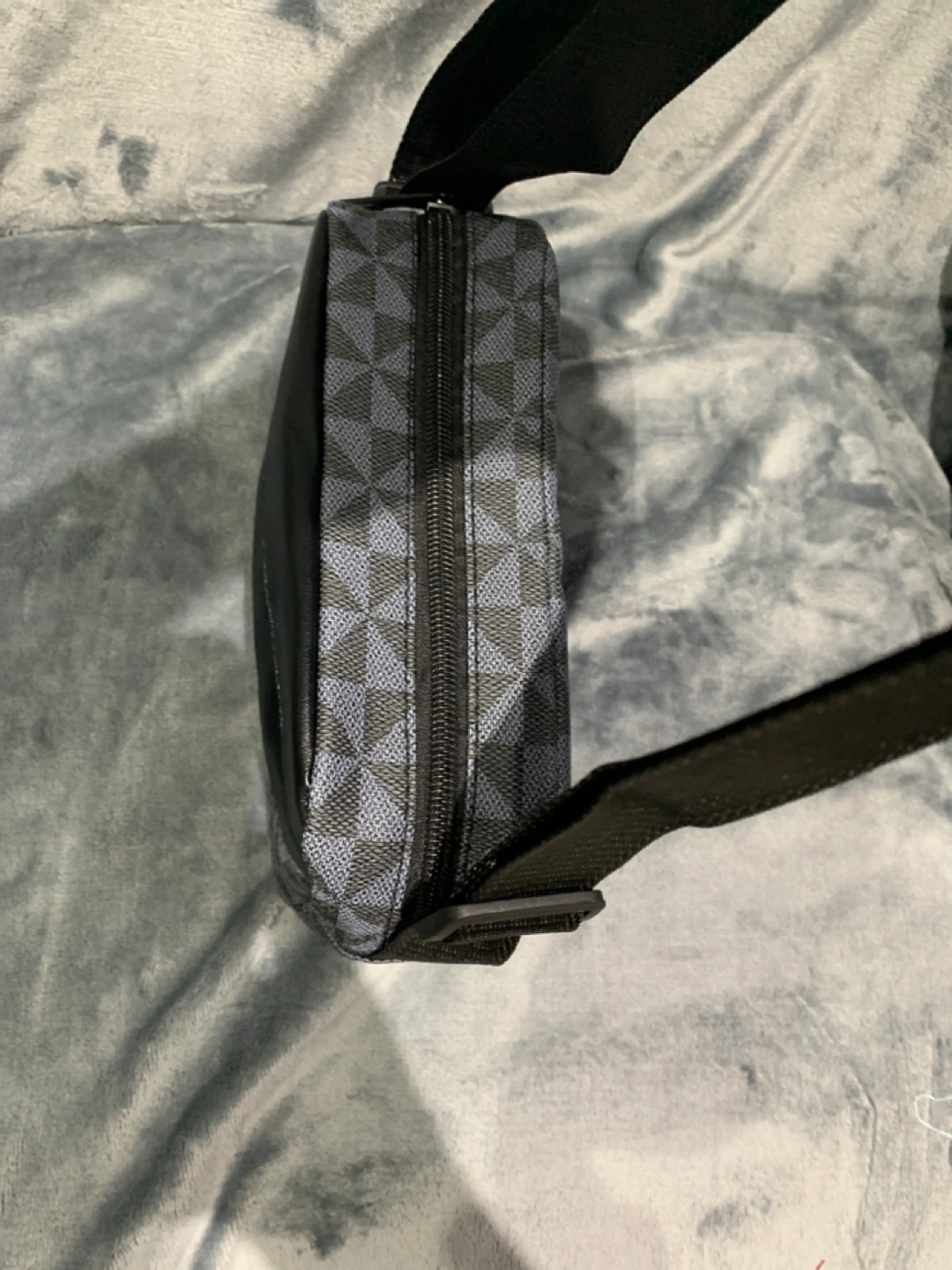 Selling a stylish black crossbody bag with a unique geometric pattern. It's in great condition and perfect for carrying your essentials while keeping your hands free