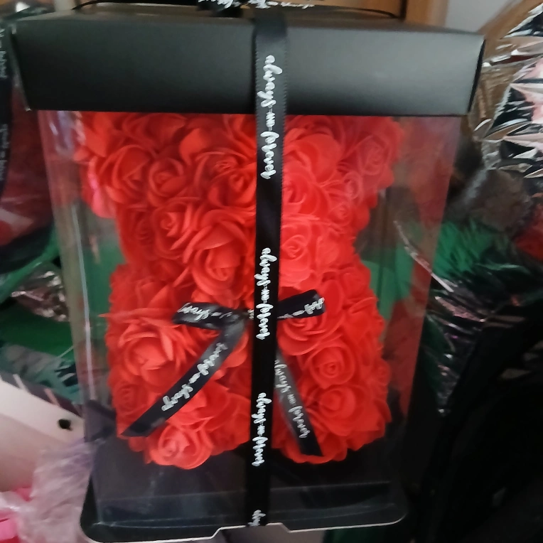 Selling a beautiful rose bear in a box, perfect as a gift or decoration! The ribbon says "Always and Forever", adding a special touch. It's in excellent condition and comes with its original box