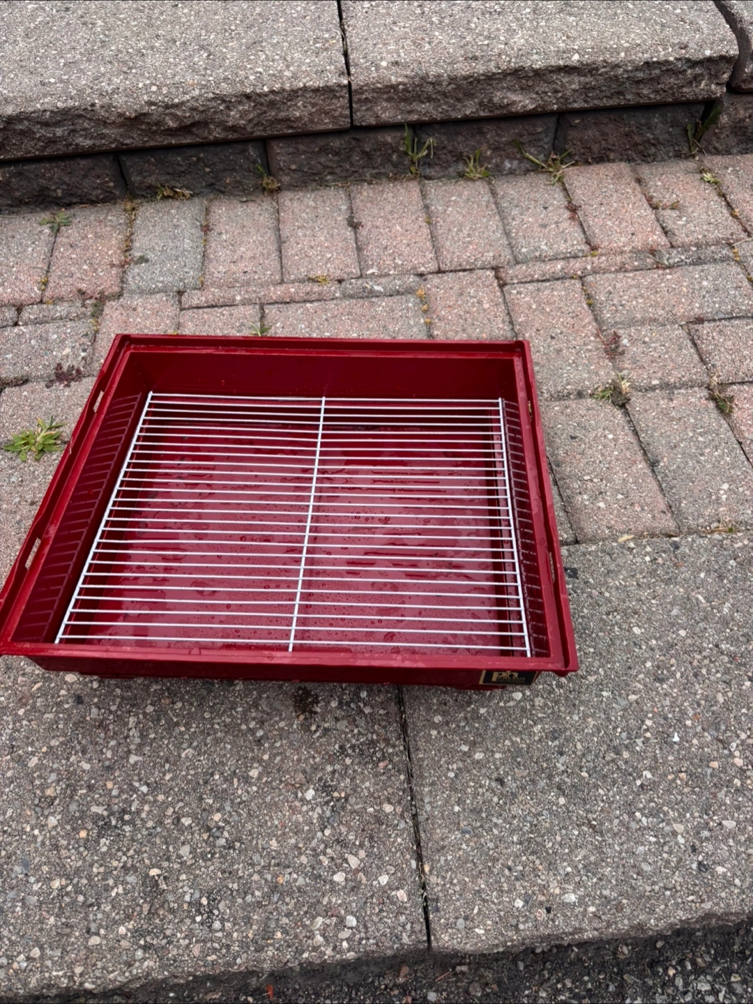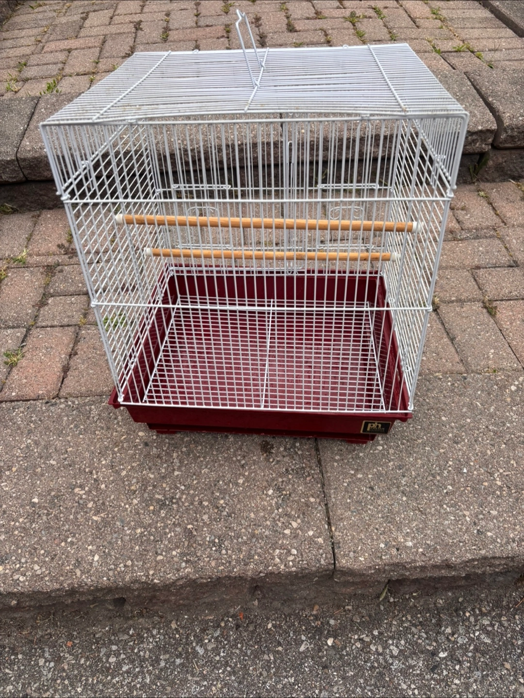 Selling a bird cage with a white wire frame and a red base. It includes perches for your feathered friend. The cage is in good condition and ready for a new home!