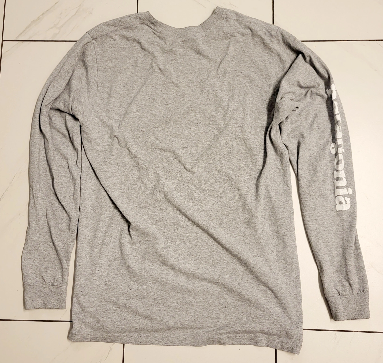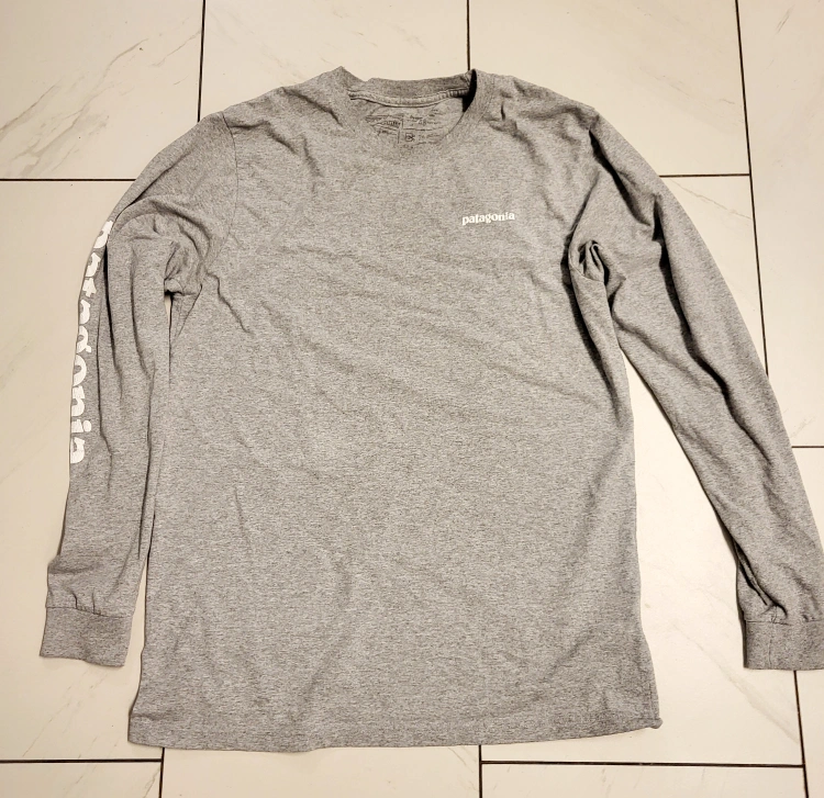 Selling a Patagonia long-sleeve t-shirt in size medium. It's a comfy grey colour and features the Patagonia logo on the chest and sleeve. Perfect for layering or wearing on its own!