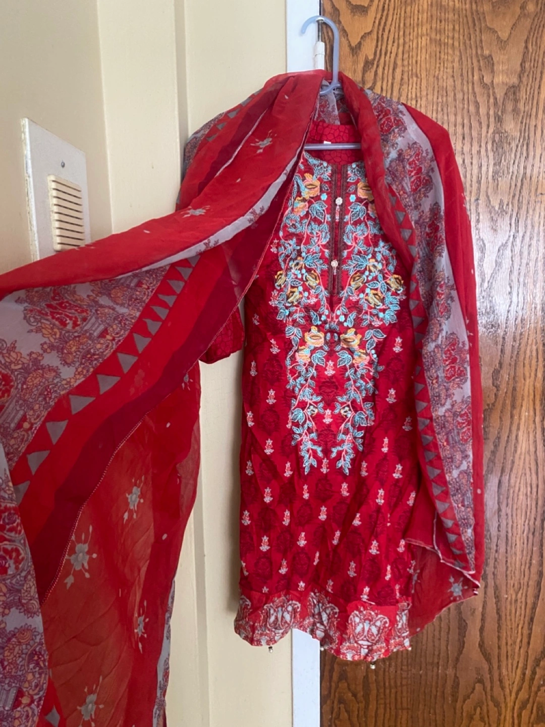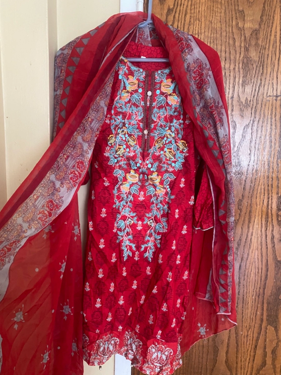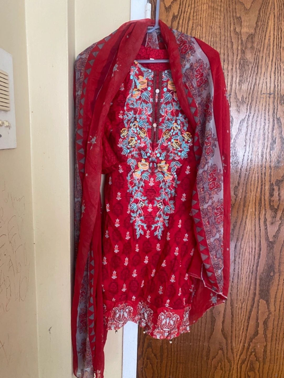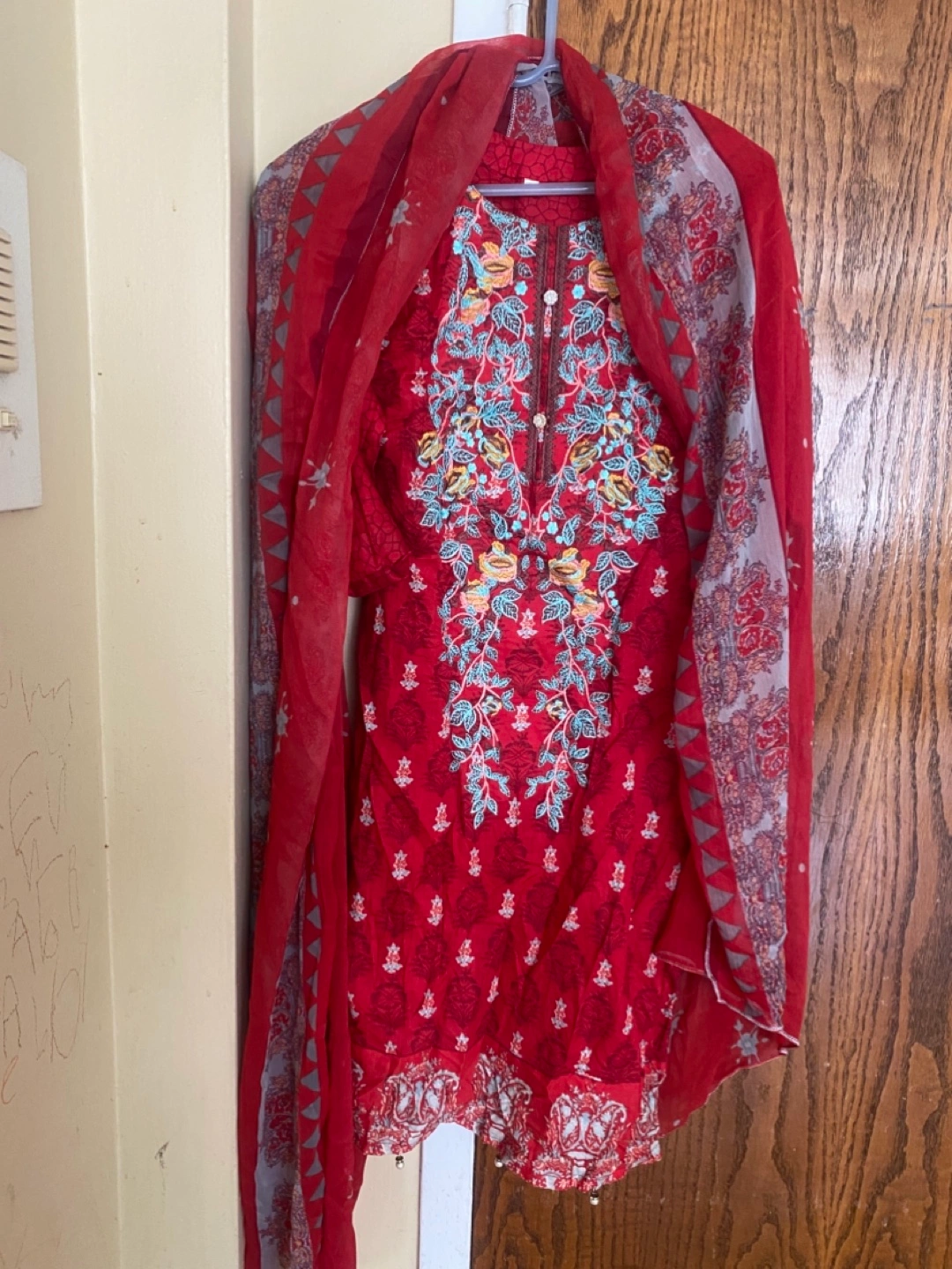 Beautiful red salwar kameez with intricate embroidery. This set includes the kameez (top), salwar (pants), and dupatta (scarf). It's in great condition and ready for a new home!