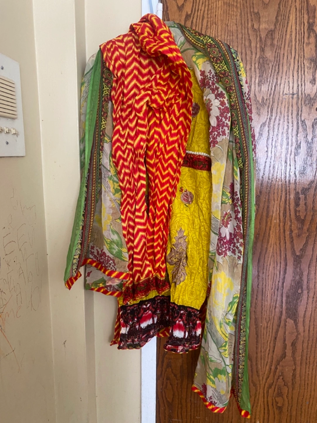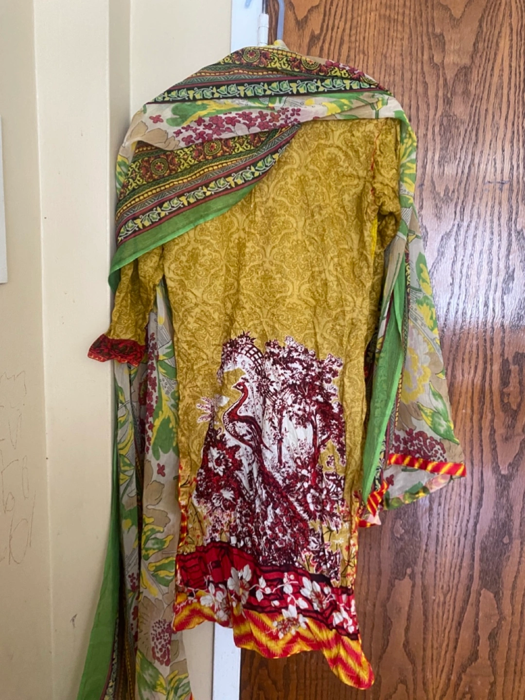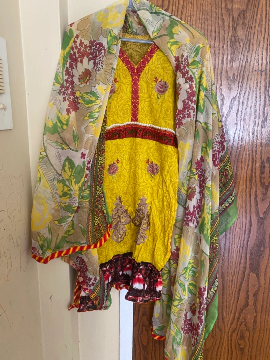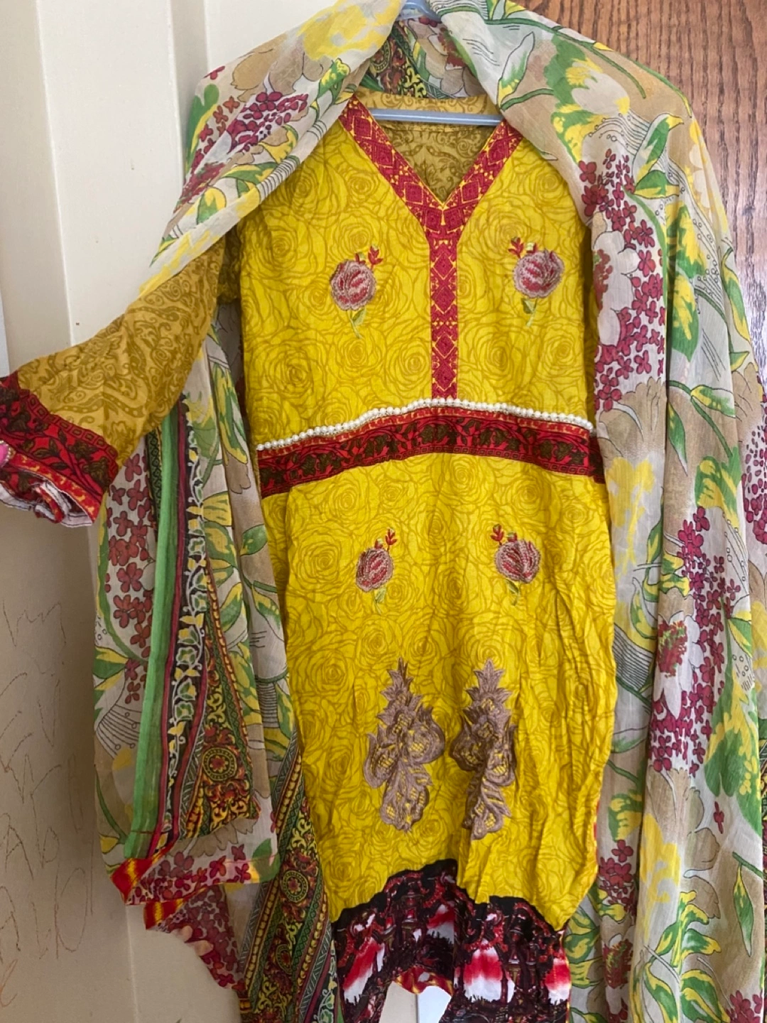 This is a yellow salwar kameez. It has a beautiful design and is in good condition! It features floral patterns and decorative trim.