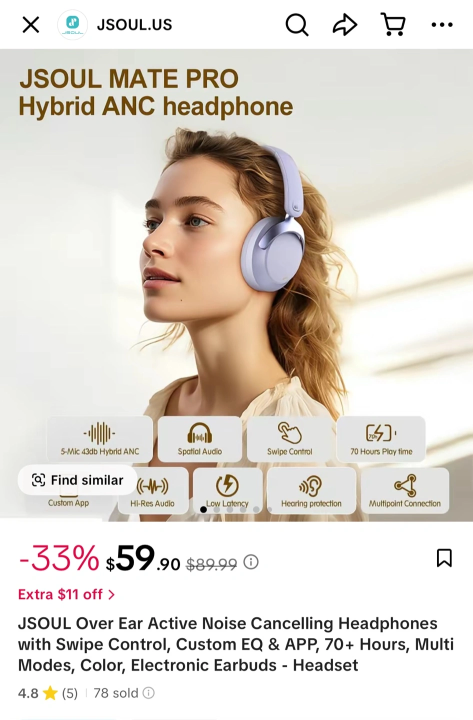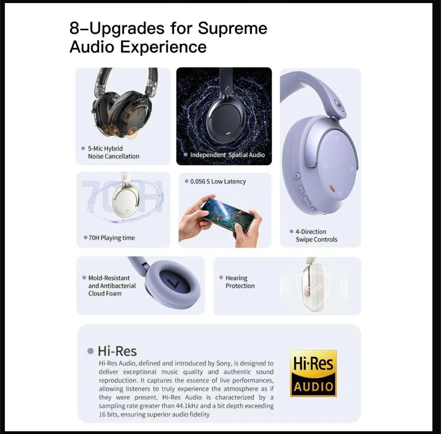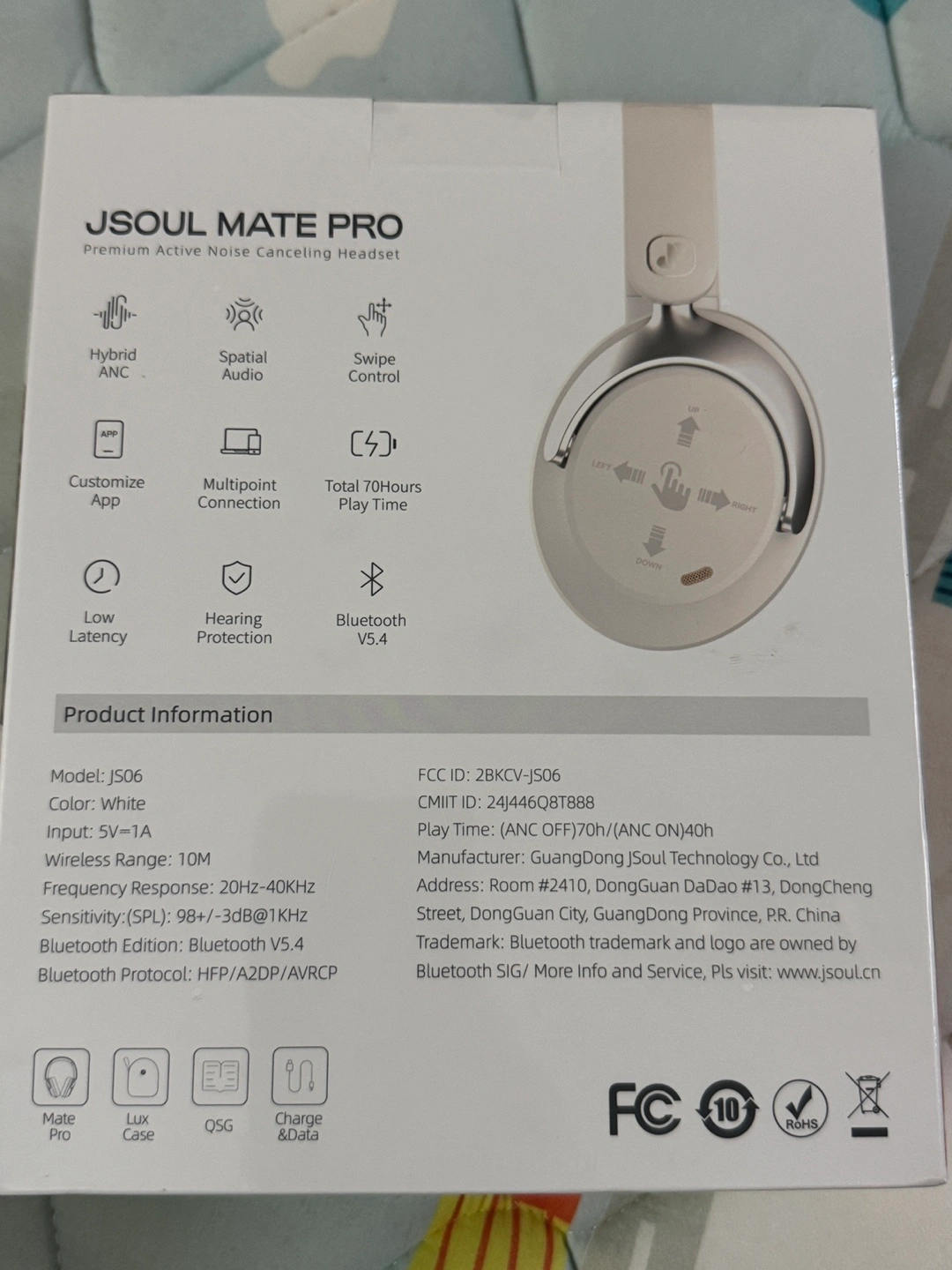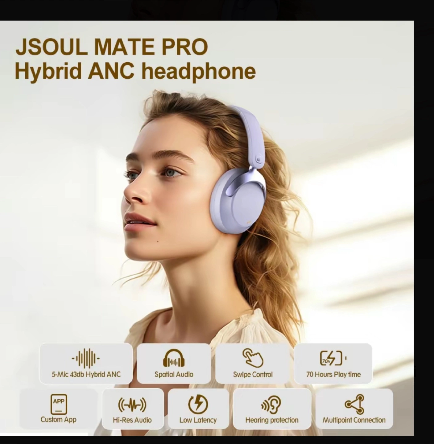 Selling a JSoul Mate Pro Hybrid ANC headphone! It features 5-Mic Hybrid ANC technology to precisely identify and isolate ambient noise. Enjoy up to 70 hours of playing time on Bluetooth mode, or 40 hours with ANC on. It also has independent spatial audio, 0.056 S low latency, 4-direction swipe controls, mold-resistant and antibacterial cloud foam, and hearing protection