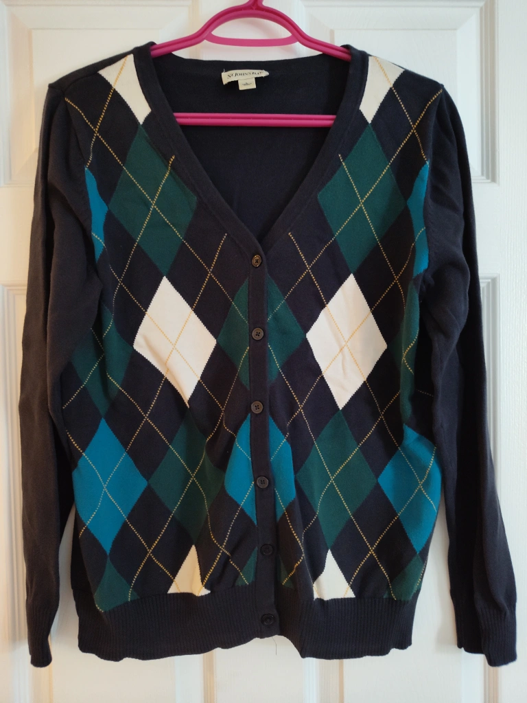 Cozy up in this St. John's Bay cardigan! It features a classic argyle pattern with navy, green, teal, and white diamonds. It's a small L and perfect for layering on those cooler day. No wear. cash p/u Streetsville