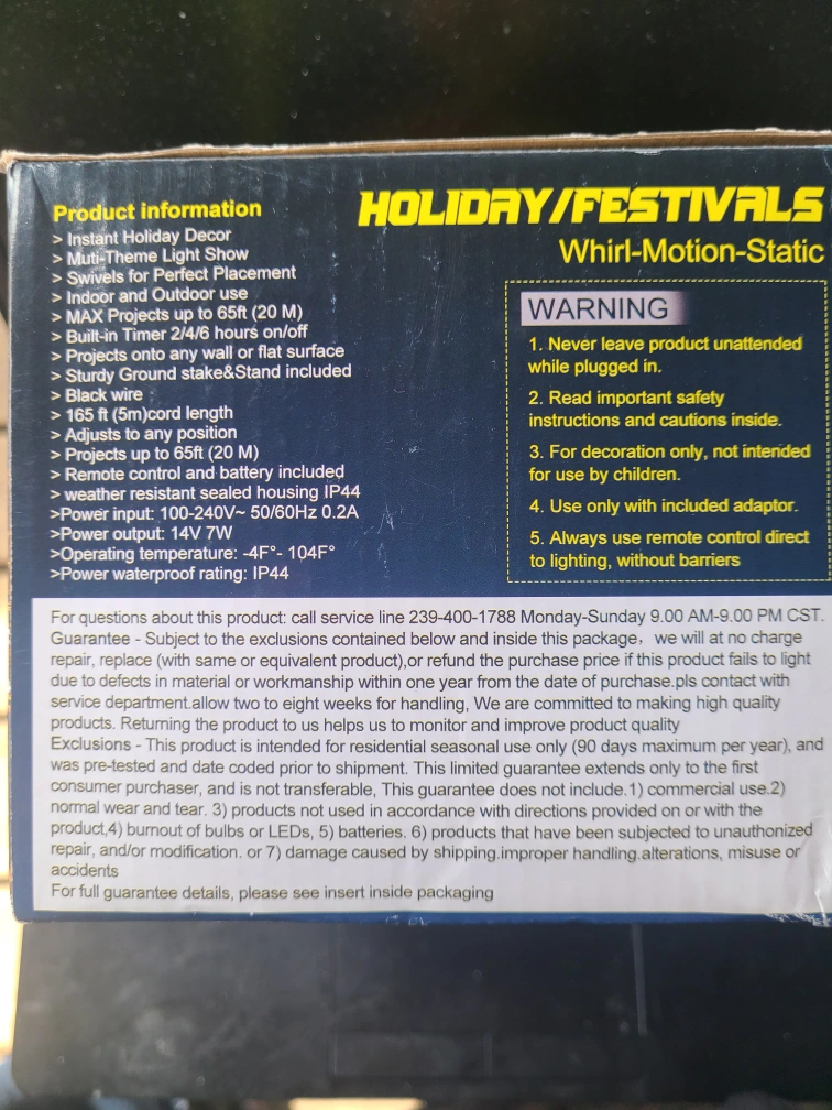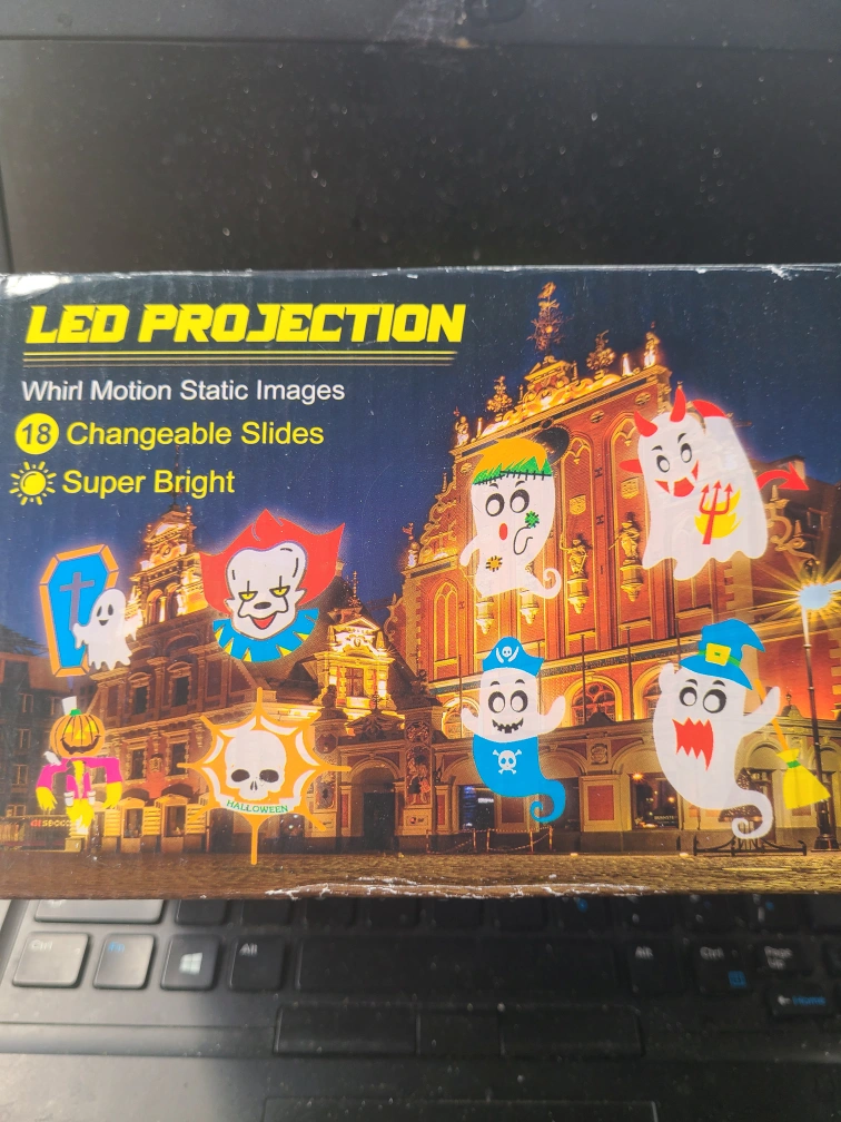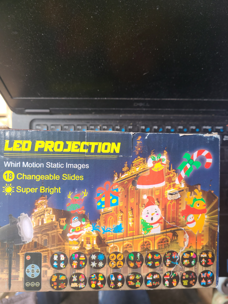Selling a LED Projection light with whirl motion static images! It comes with 18 changeable slides and is super bright. It's suitable for indoor and outdoor use and projects up to 65ft (20m). It also has a built-in timer for 2/4/6 hours on/off and a remote control is included!