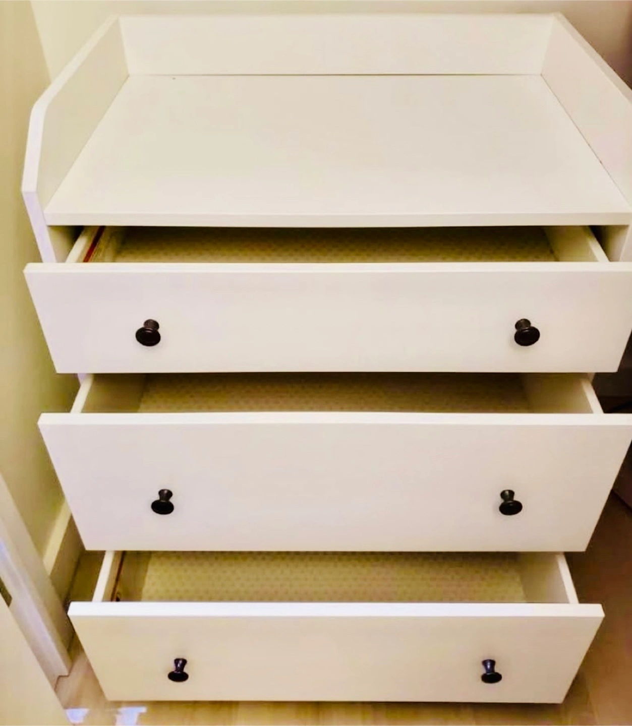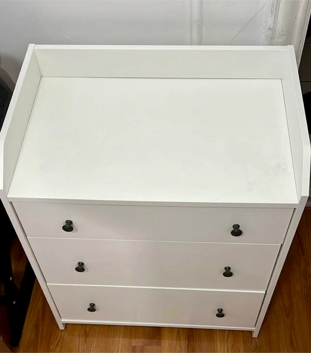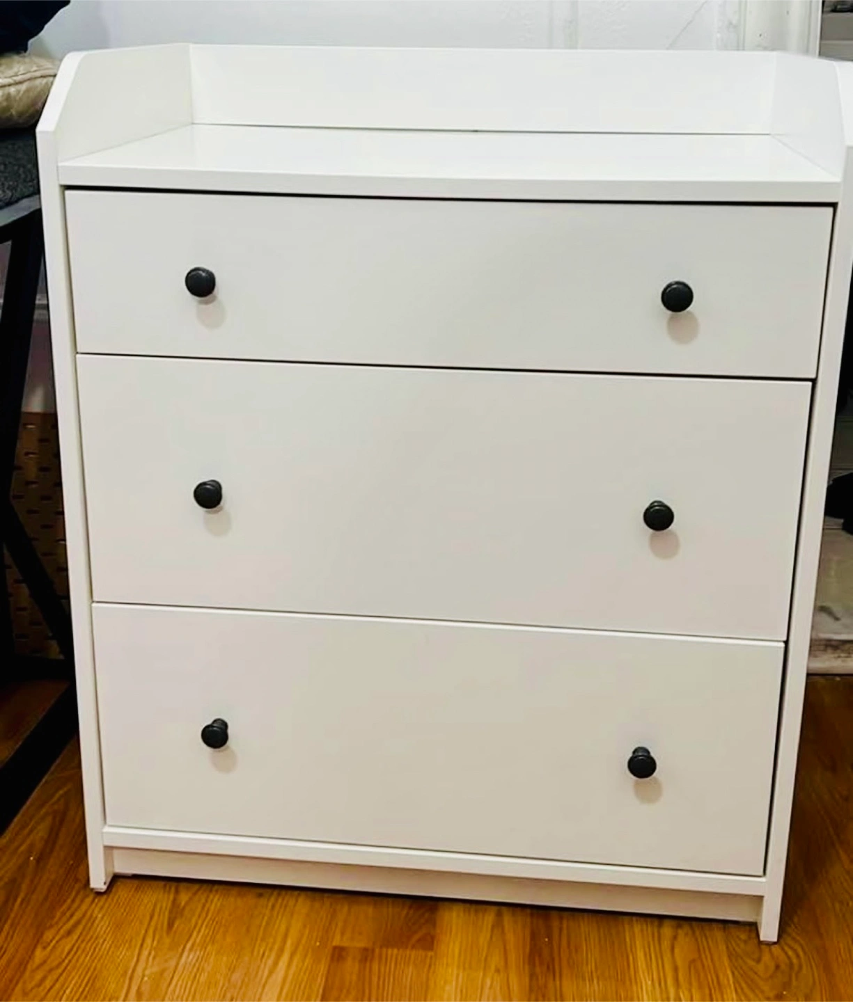 Here's a clean, white dresser with three drawers! It would be perfect for a kids room or nursery. All the drawers open and close smoothly. Width: 33.37 inches, Height: 27.5 inches, Depth: 18.37 inches