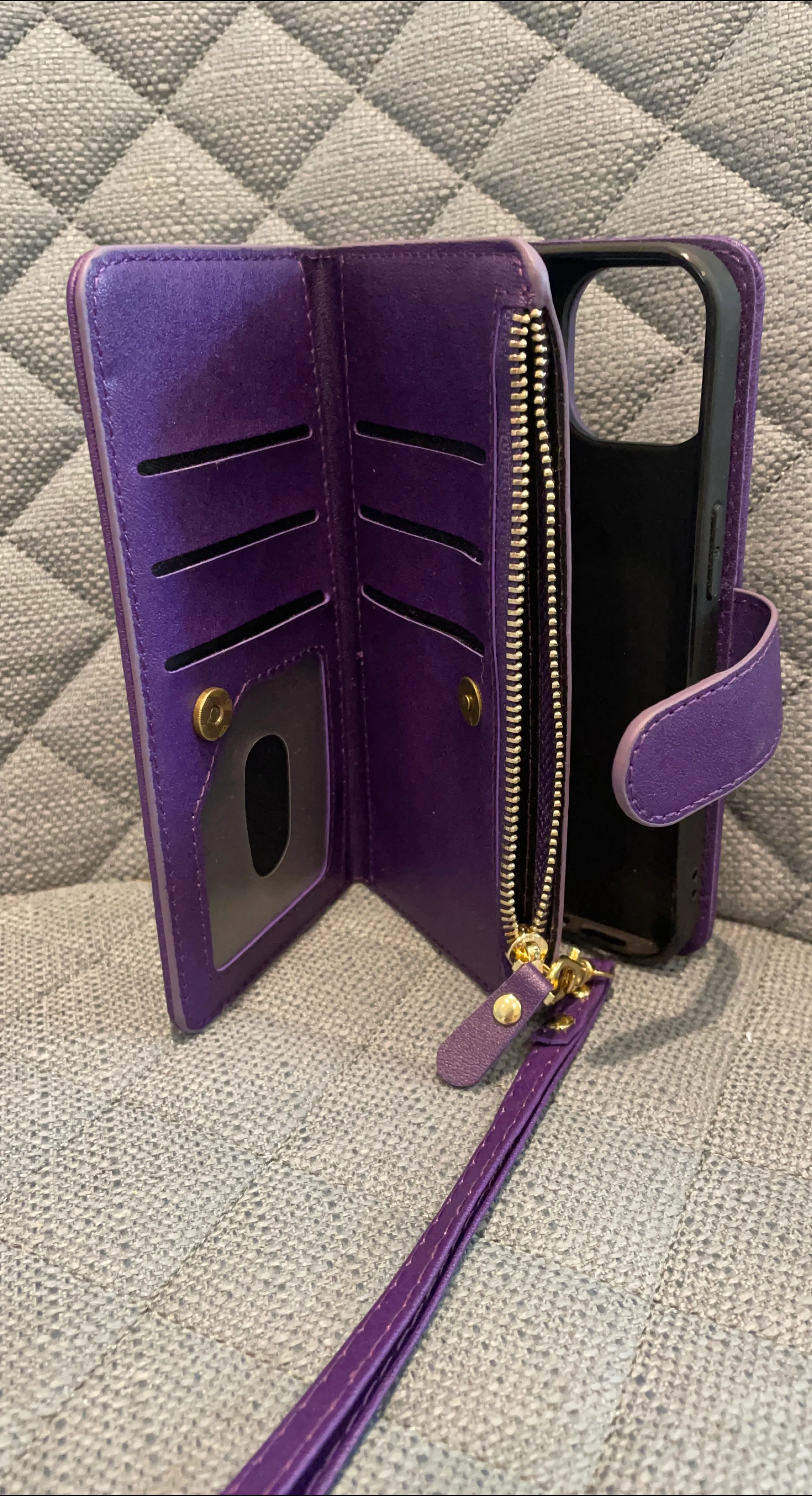 Selling a purple wallet-style phone case! It has several card slots, a zippered compartment, and a wrist strap. It appears to be in great condition and ready for a new home