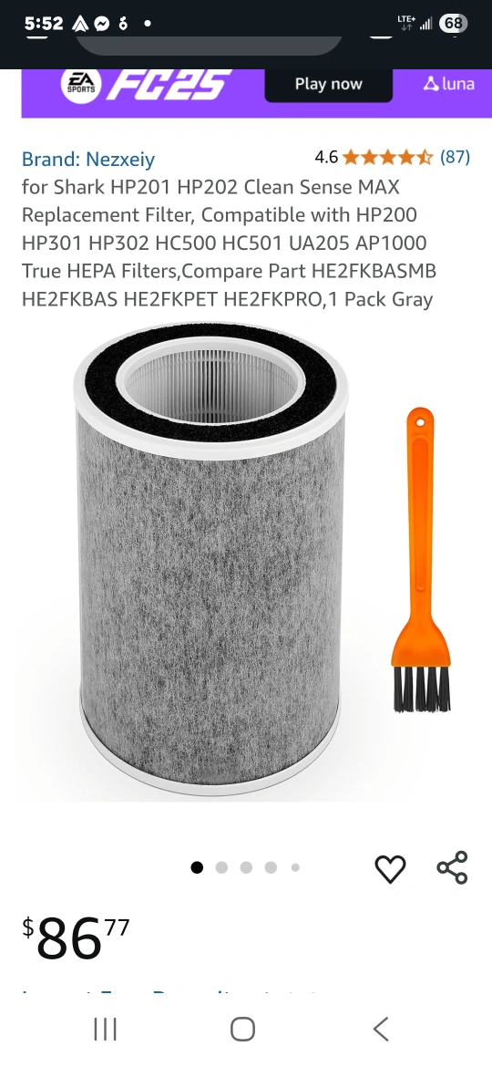 Selling a replacement filter for Shark air purifiers. It's a Nezxeiy brand filter compatible with HP201, HP202, and Clean Sense MAX models. It's also compatible with HP200, HP301, HP302, HC500, HC501, UA205, AP1000 True HEPA filters, and HE2FKPET HE2FKPRO. Compare to part HE2FKBASMB.