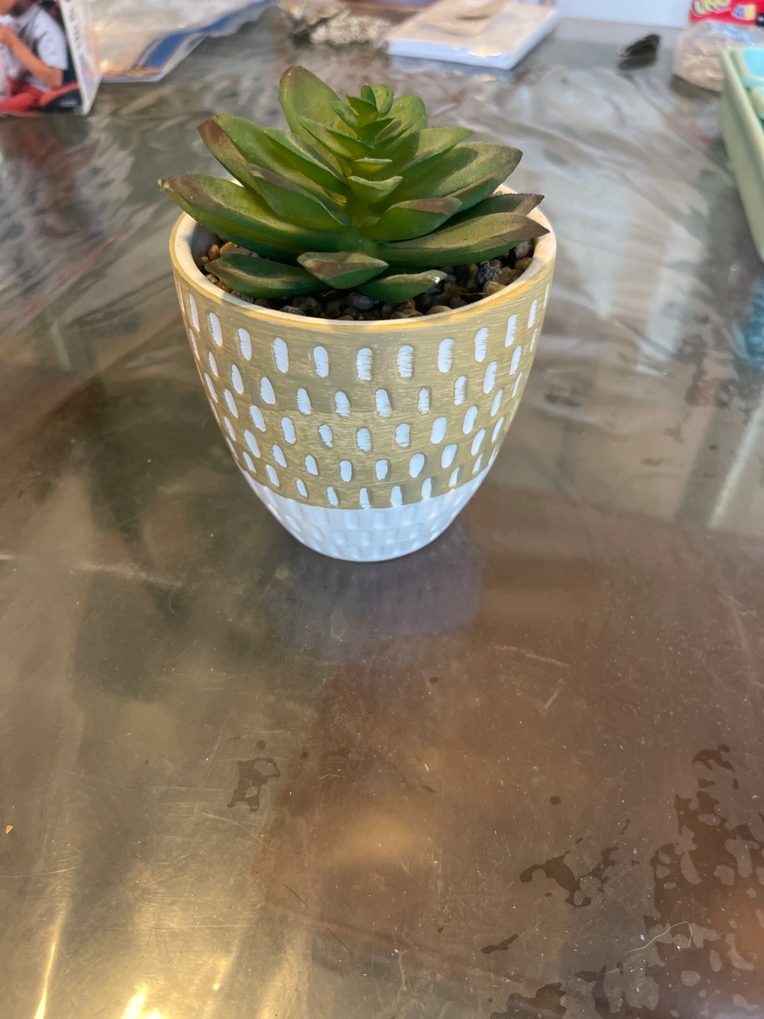 I'm selling a small decorative succulent in a cute pot! It's in great condition and would look perfect on a shelf or desk. It adds a touch of greenery to any space