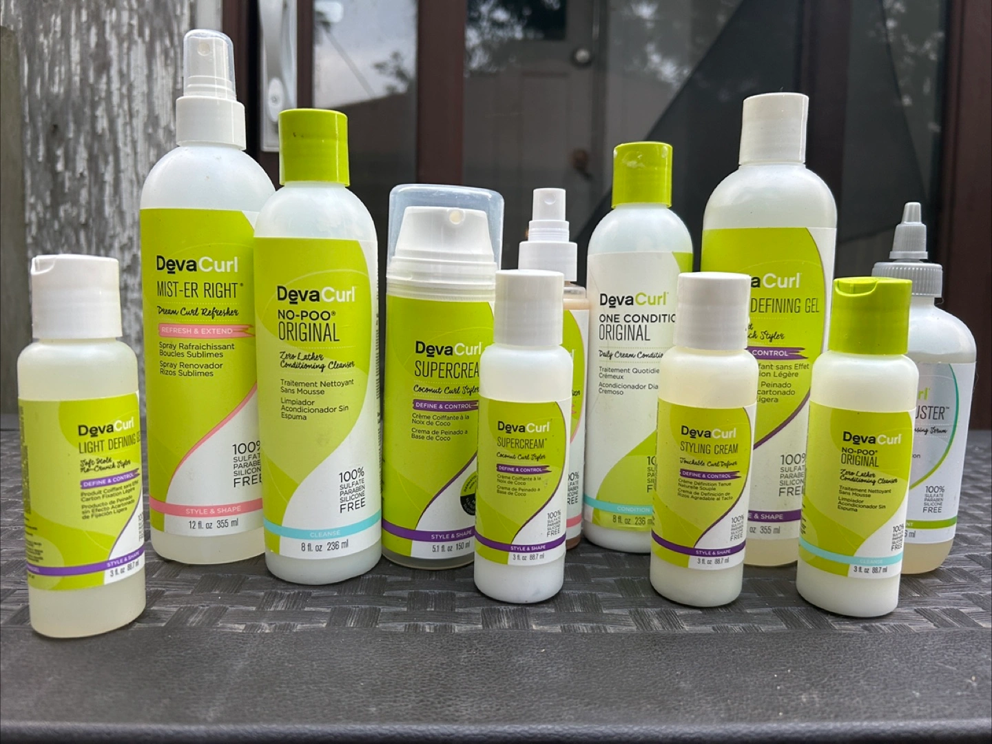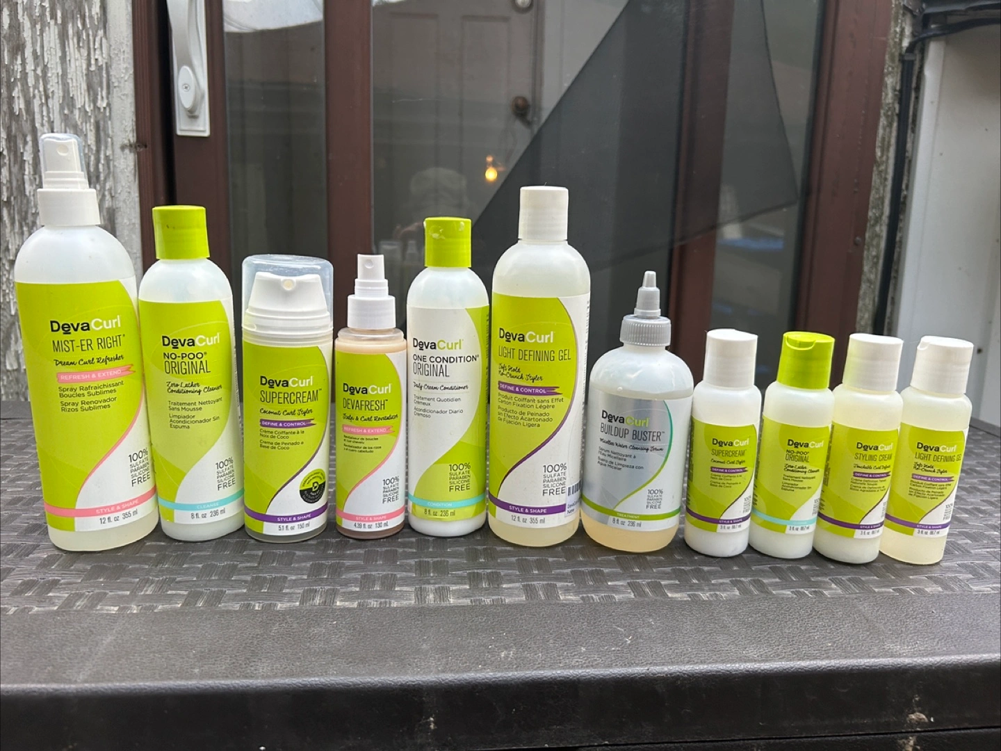 Selling a collection of DevaCurl hair products! Includes a variety of items like Mist-er Right, No-Poo Original, Supercream, One Condition Original, Light Defining Gel, and more. Perfect for curly hair care!