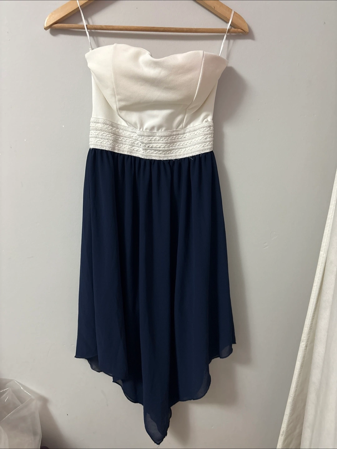 Selling a cute strapless dress in navy and cream. It's in great condition and ready for a new home! Perfect for a party or a night out