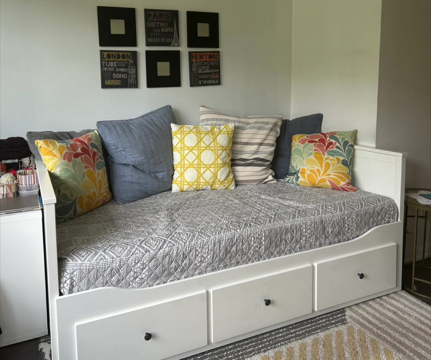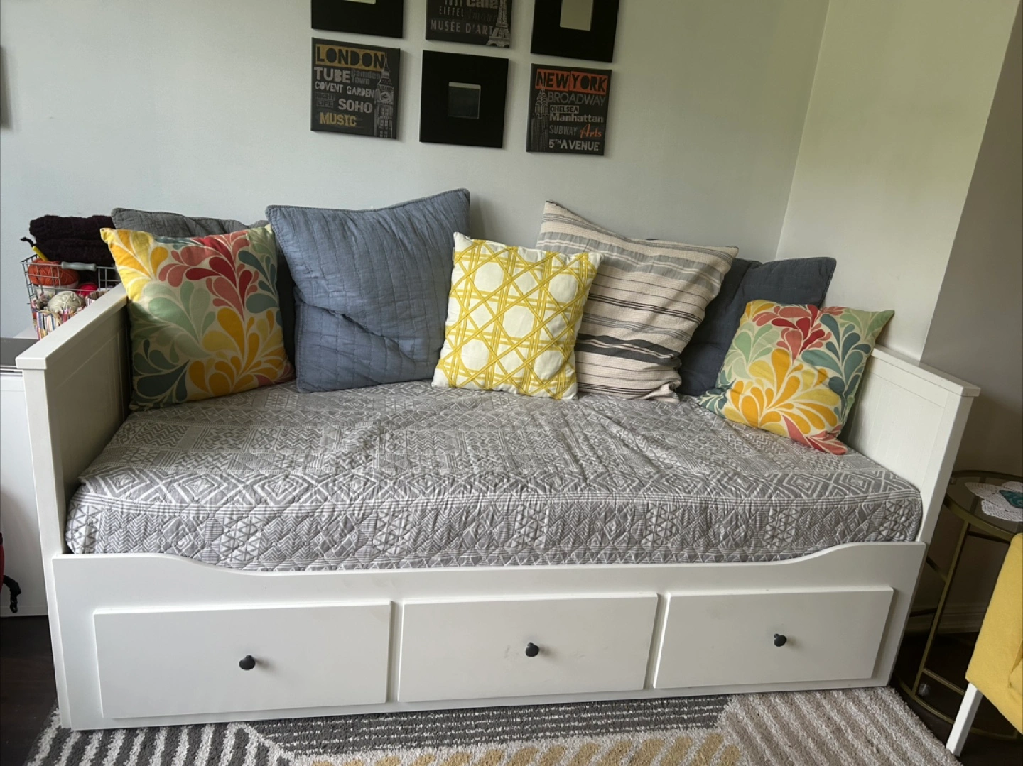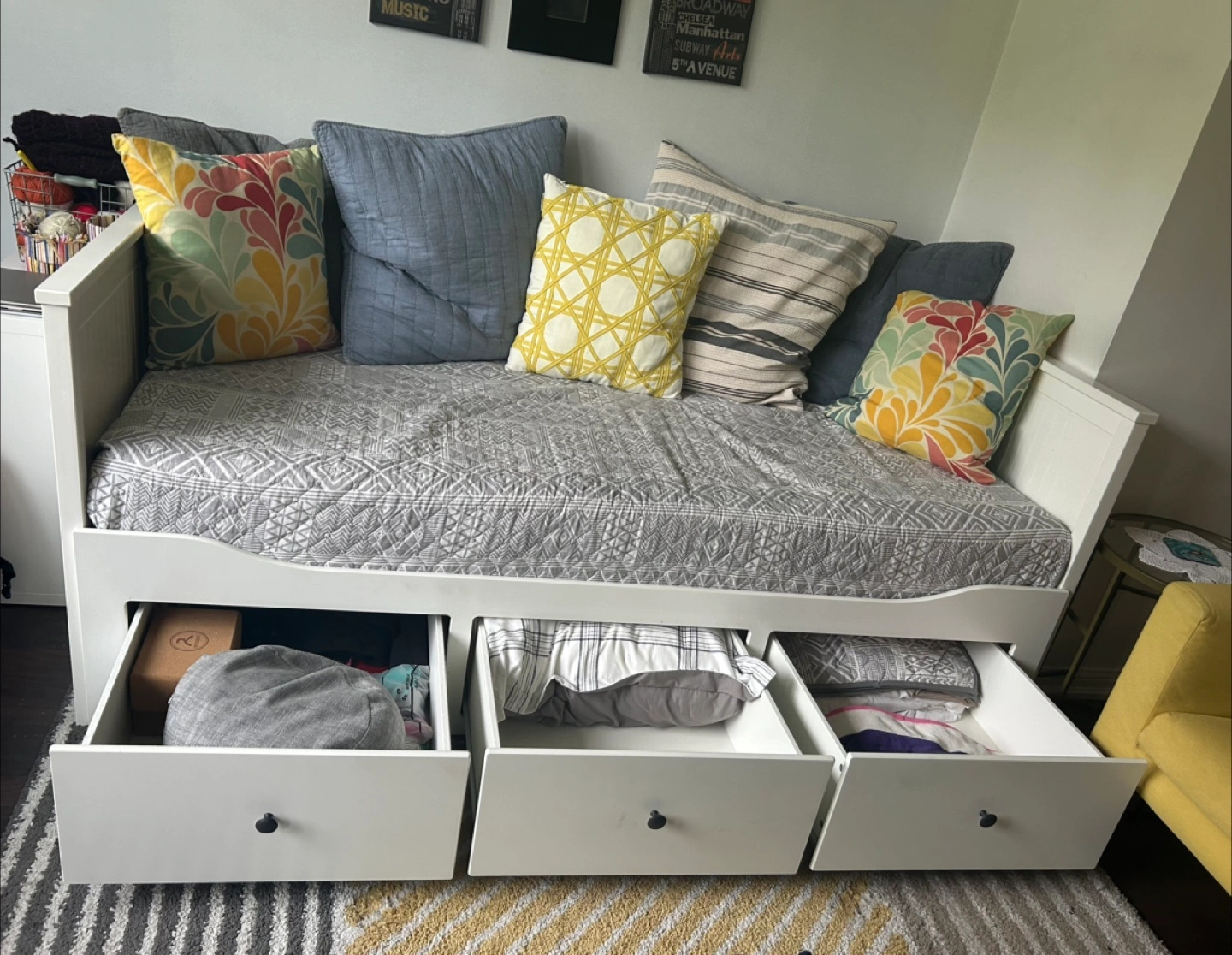 Selling a comfy white daybed! It comes with handy drawers underneath for extra storage. Great for a guest room or a cozy spot to relax in your living room.