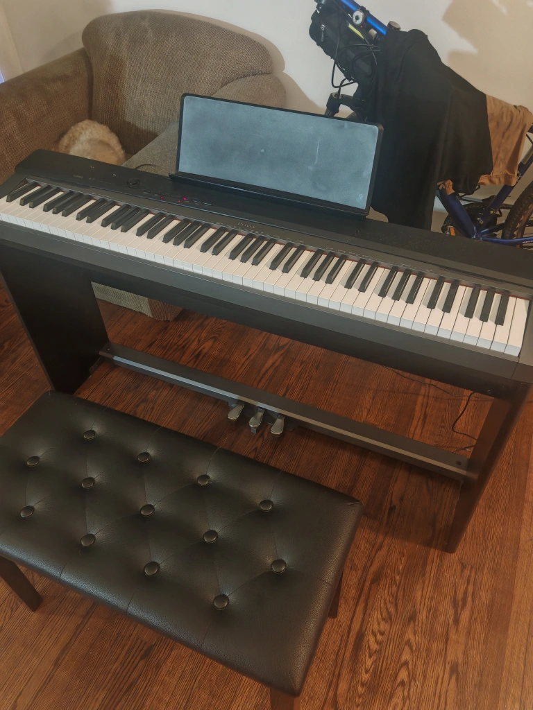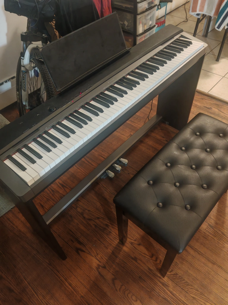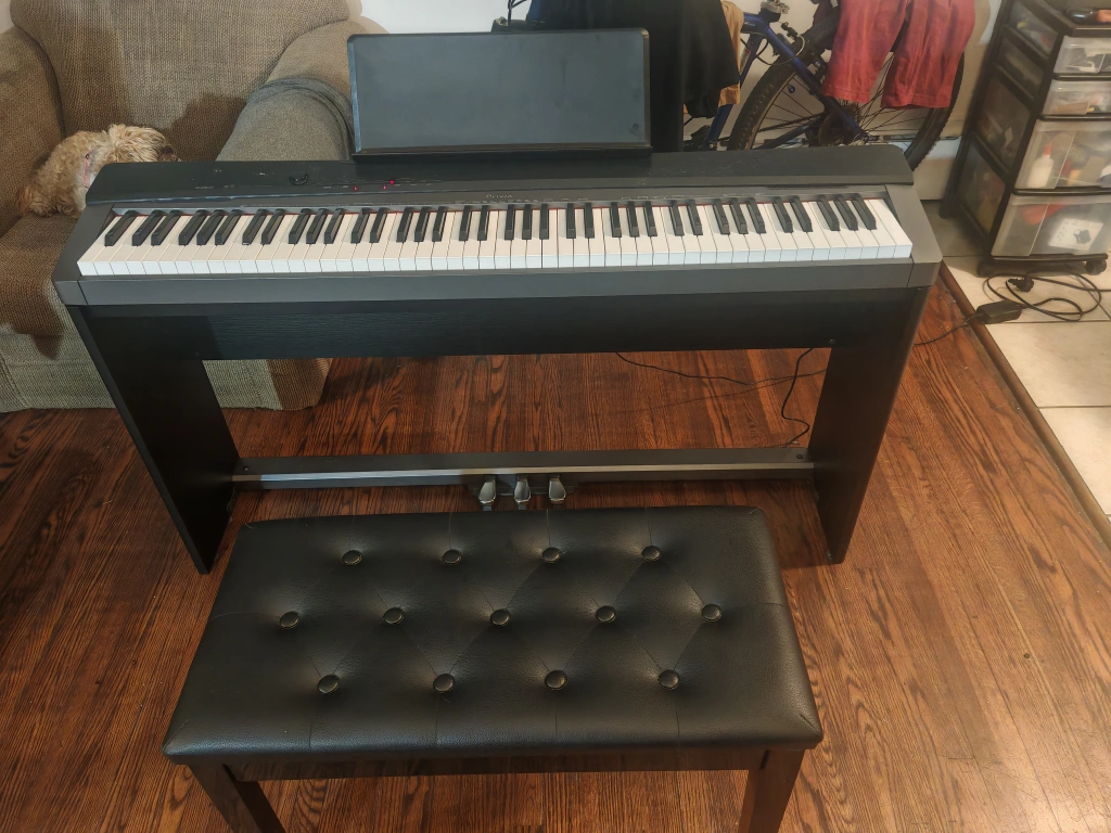 Casio Privia PX-130, 88 fully weighted keys digital piano in excellent condition with stand, music rest, power adapter, headphones, bench/storage and triple pedal.