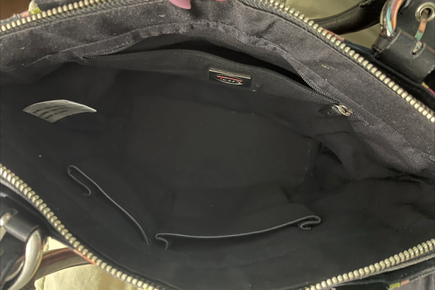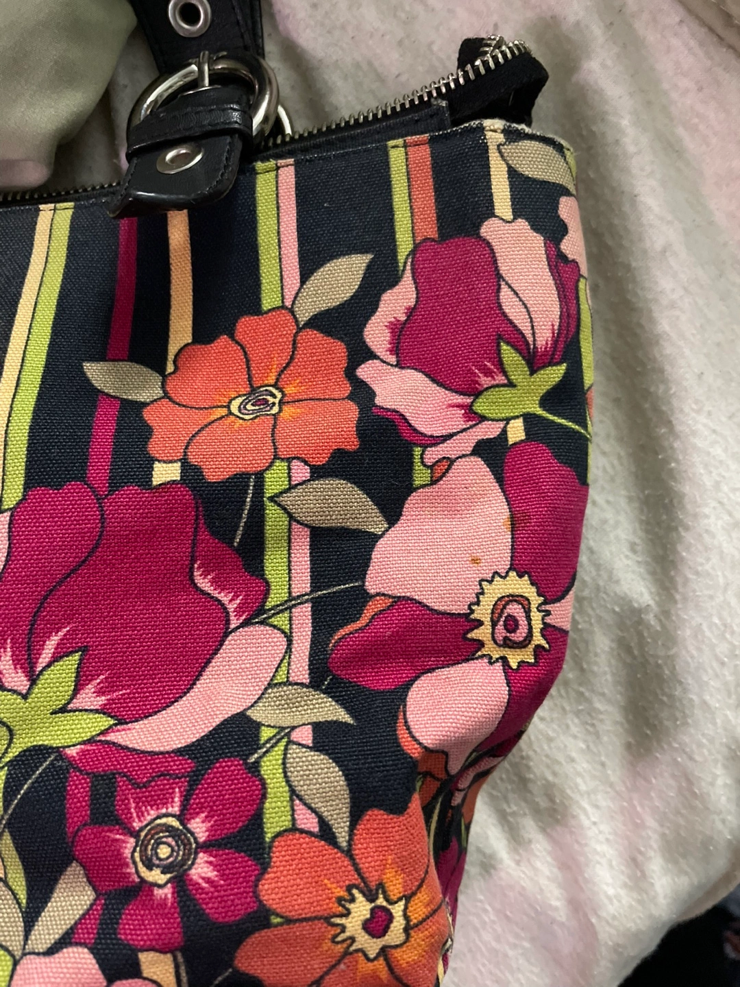 This is a Talbots tote bag with a floral and striped design. It features black handles and a zippered closure. The bag is in decent condition. It just has one stain shown in picture. But it’s ready for a new home!