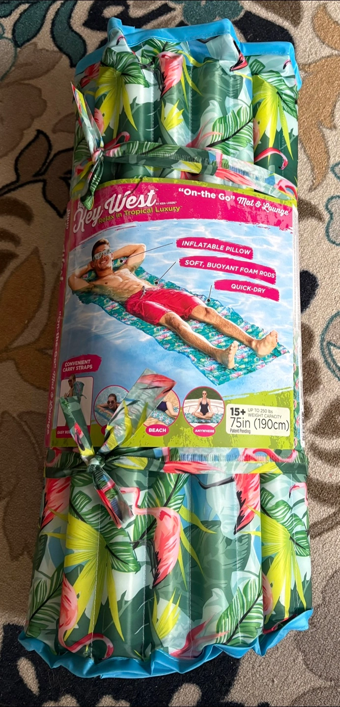 Brand new Aqua Key West "On-the-Go" Mat & Lounge! It's perfect for relaxing in tropical luxury, whether you're at the pool, beach, or anywhere else! It features an inflatable pillow, soft, buoyant foam rods, and is quick-dry. Plus, it has convenient carry straps for easy transport. It can hold up to 250 lbs and is 75 inches (190cm) long.