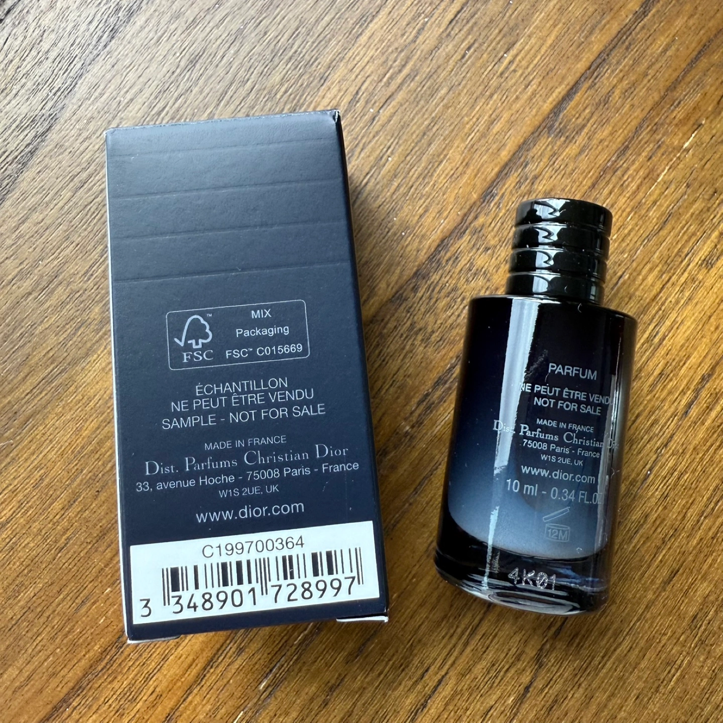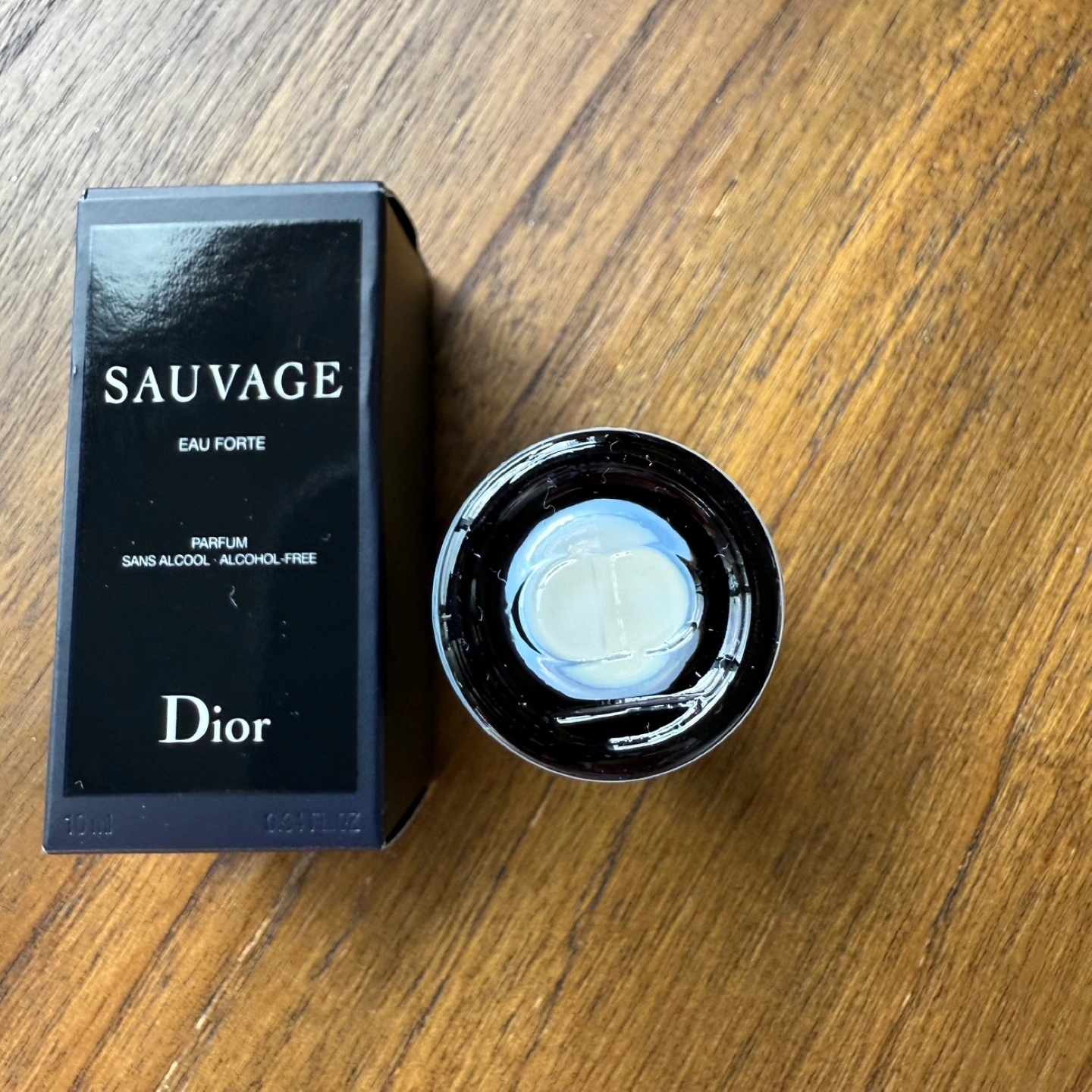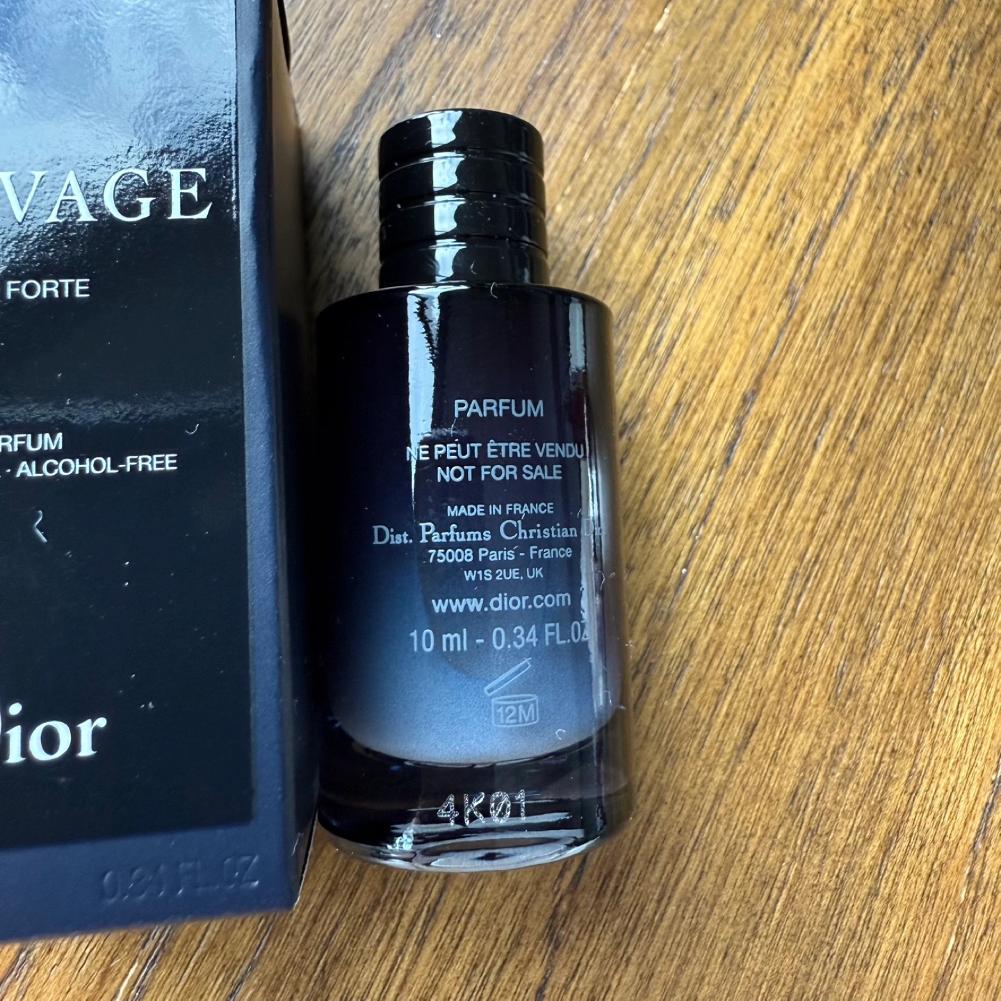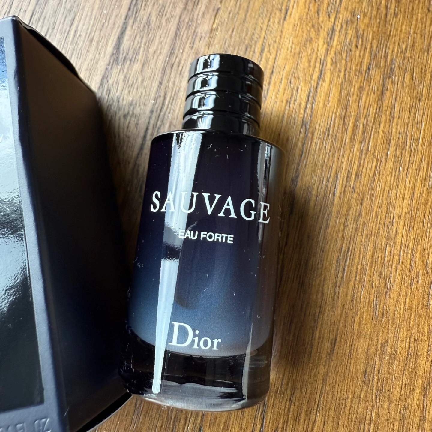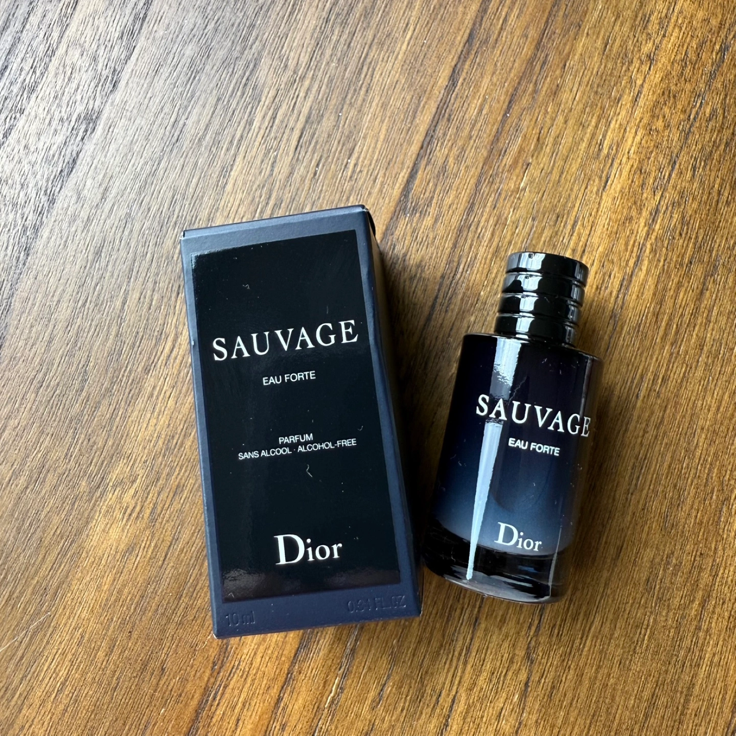Selling a Dior Sauvage Eau Forte perfume. It's a 10ml bottle and comes with the box. The bottle says "NOT FOR SALE" so it's a sample size.