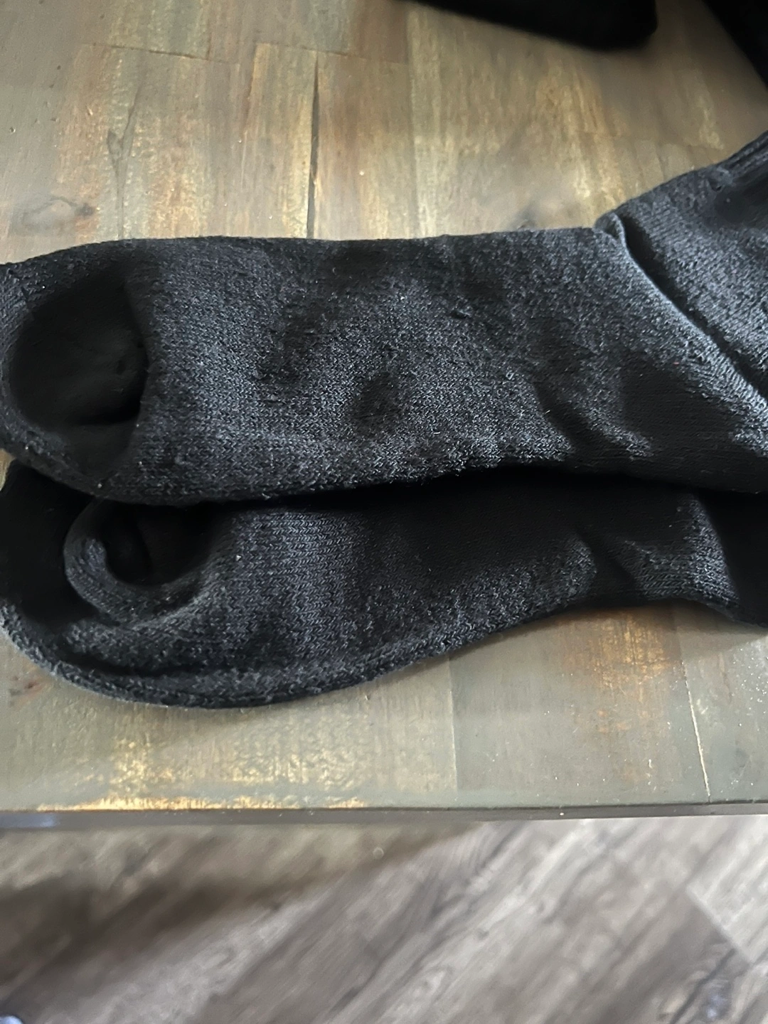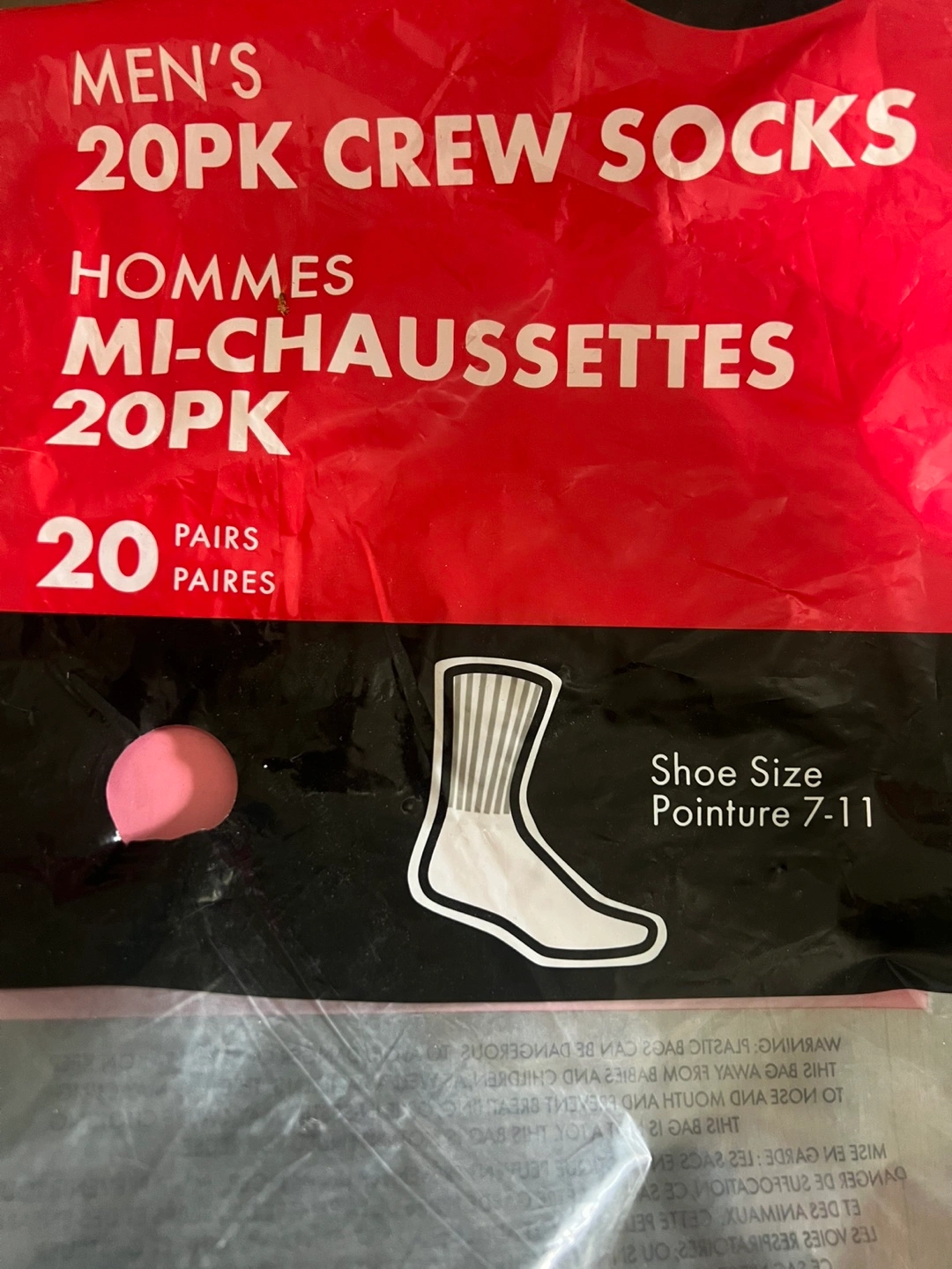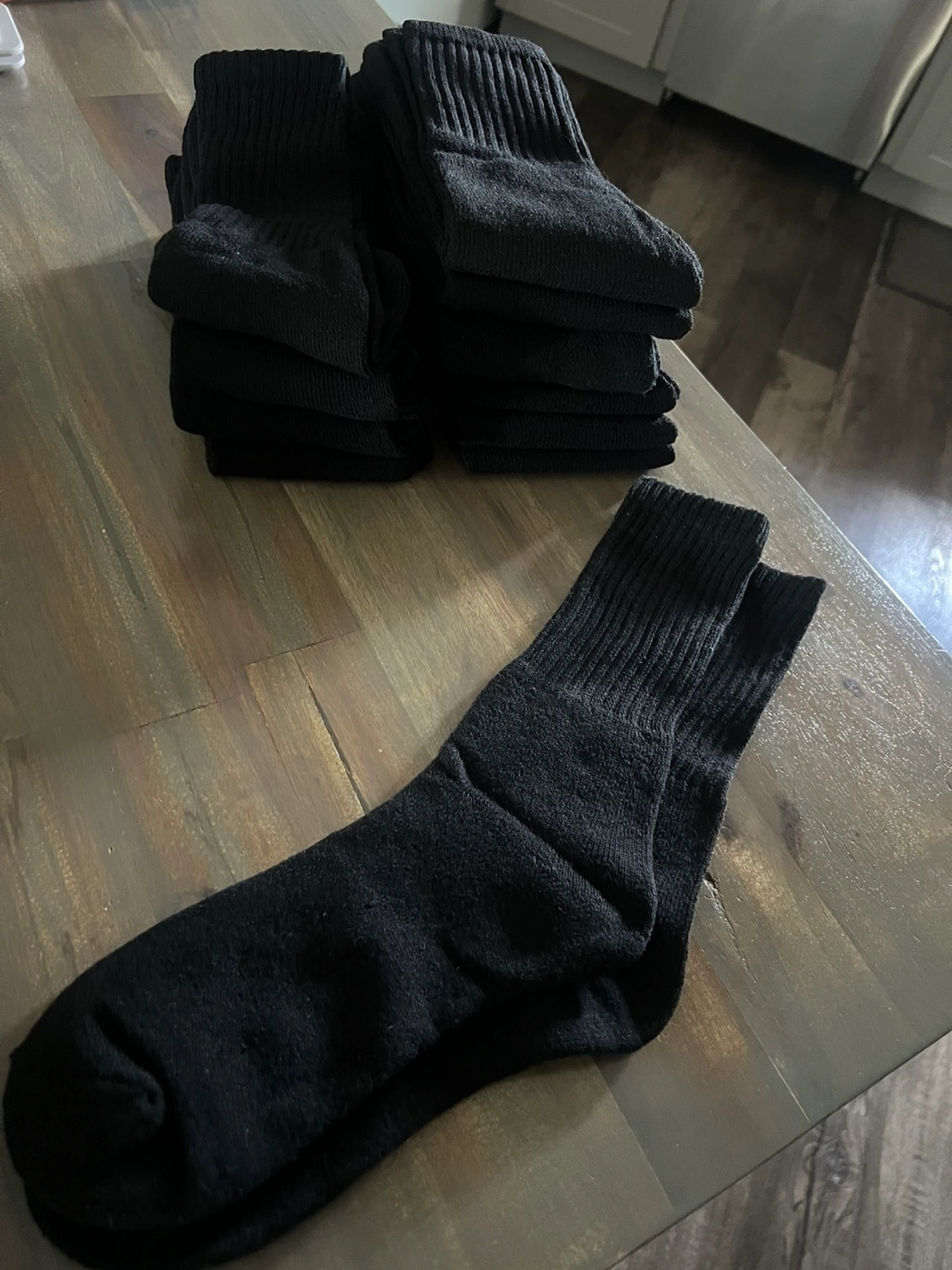 Selling a pack of men's crew socks. They are black and size 7-11. There are 11 pairs of socks included.