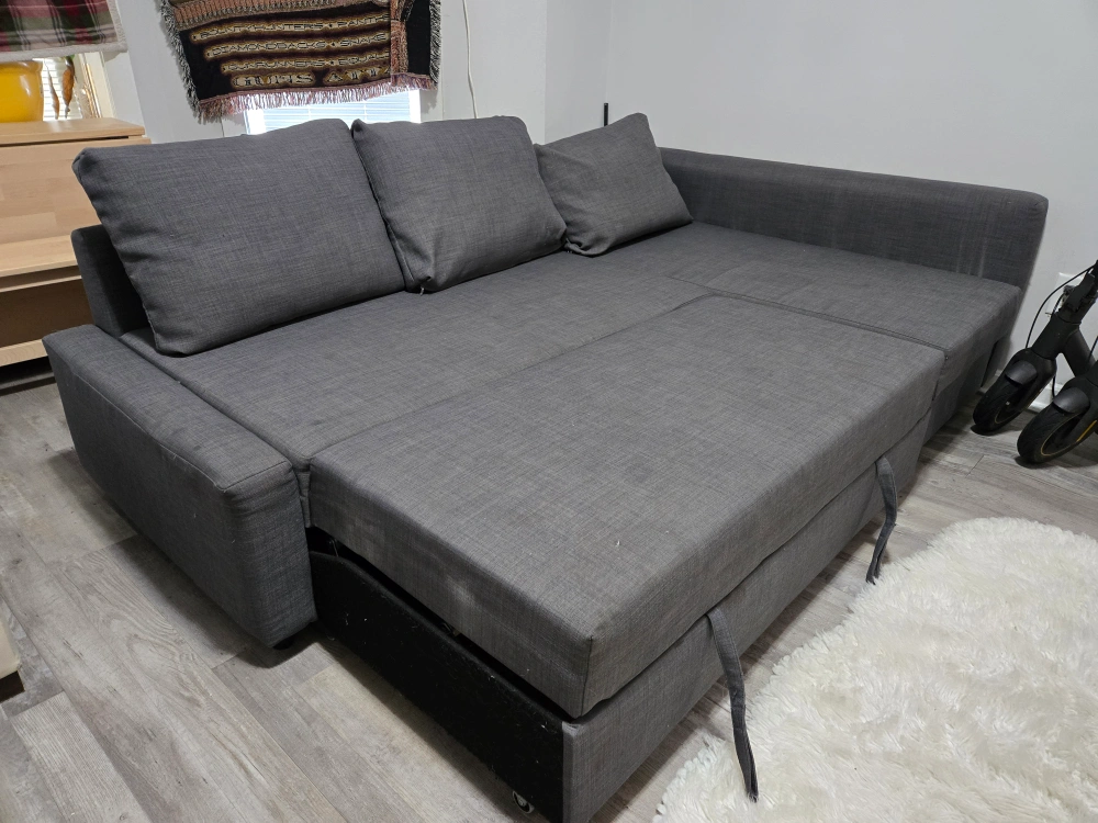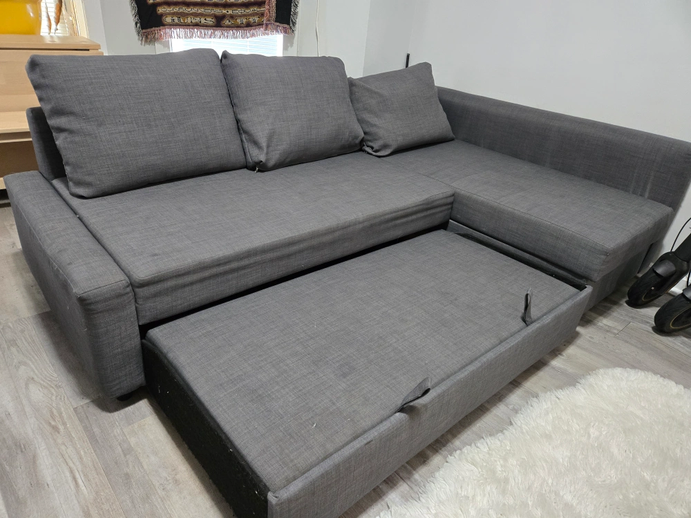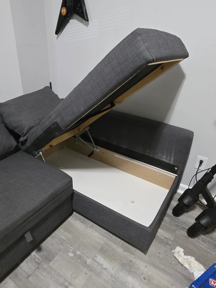 Selling a gray sleeper sofa with built-in storage! It's in great condition and perfect for guests or small spaces. The sofa easily converts into a bed and has a convenient storage compartment underneath for blankets or pillows