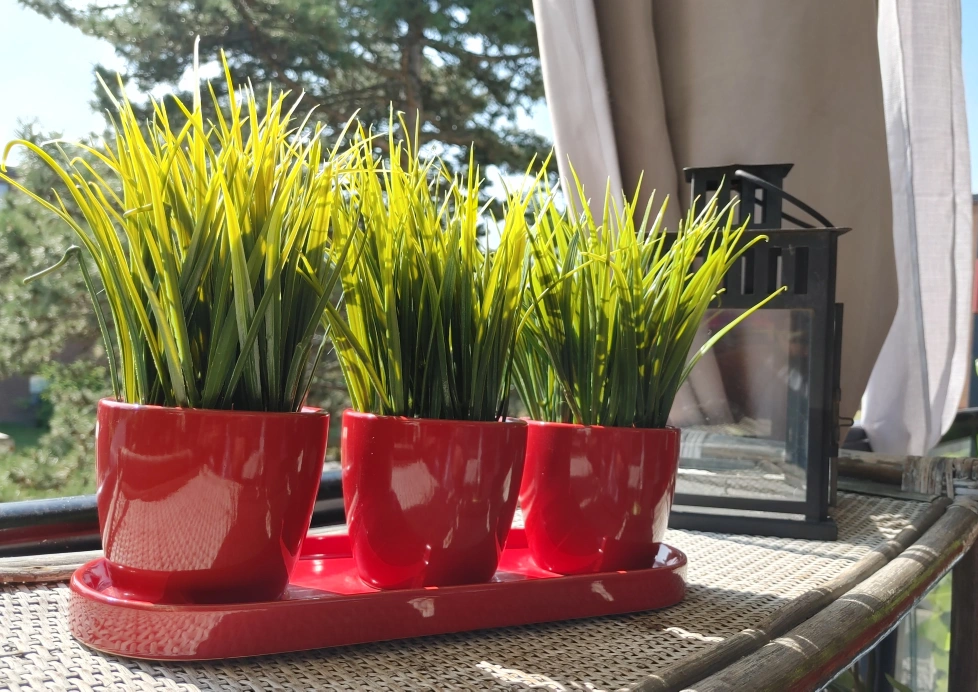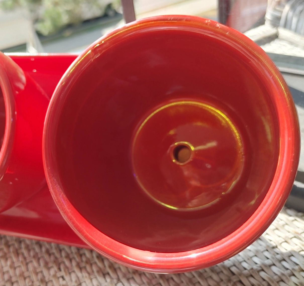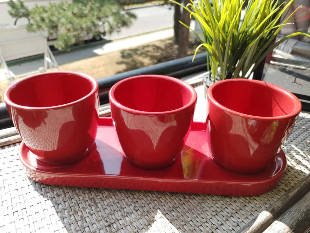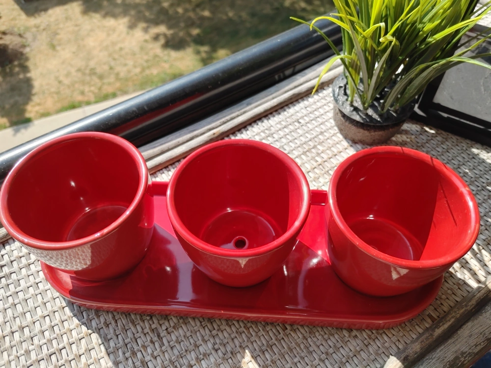Cute, red ceramic planter with three pots attached to tray! Perfect for small plants, herbs, or succulents to brighten up your space.
