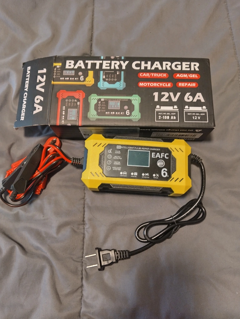 Selling an EAFC 12V 6A battery charger! This charger is suitable for car, truck, and motorcycle batteries. It supports AGM/GEL and is designed for repair. It works with WET, MF, GEL, and AGH batteries, ranging from 2-100 Ah. The box is included!