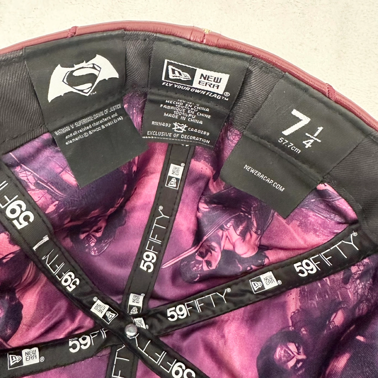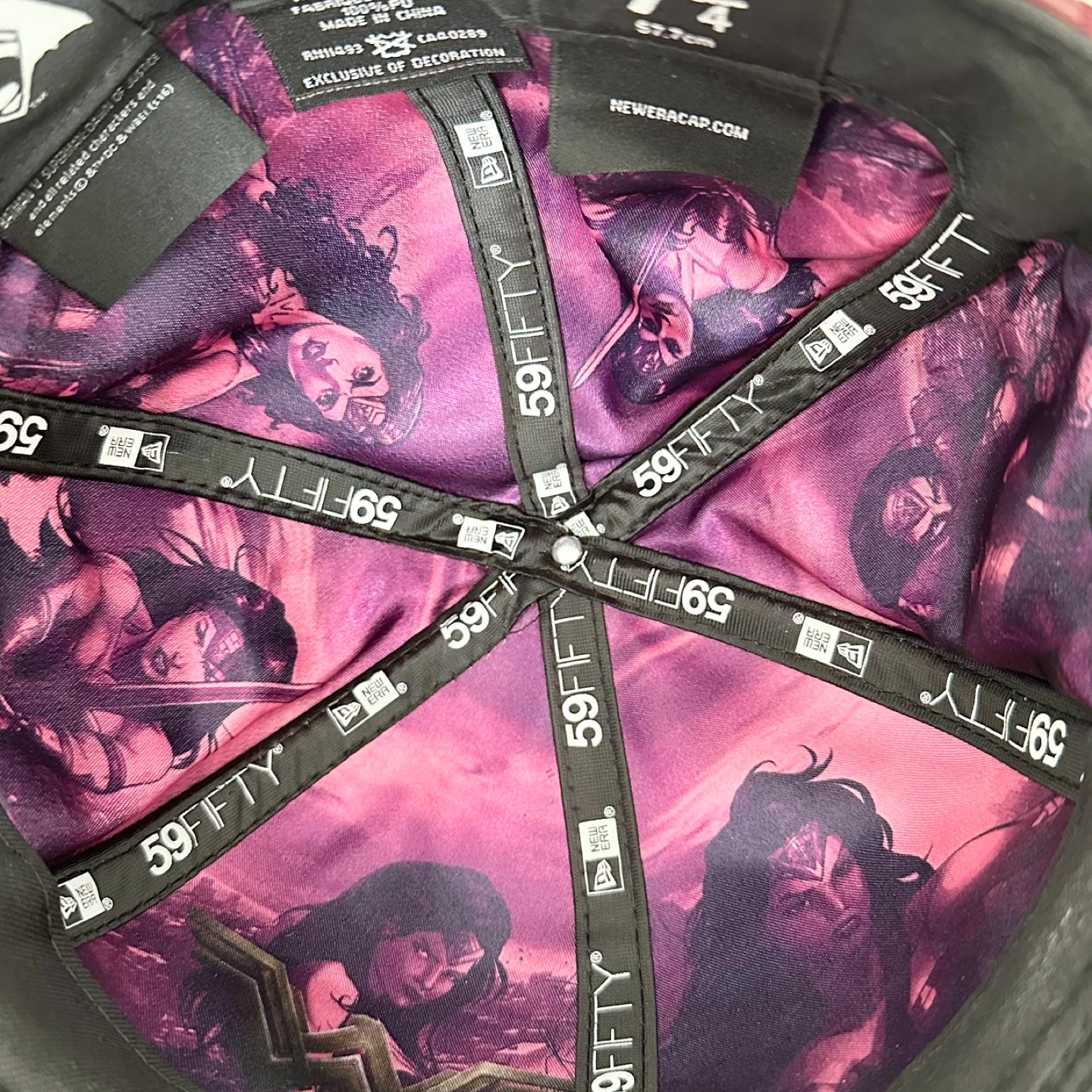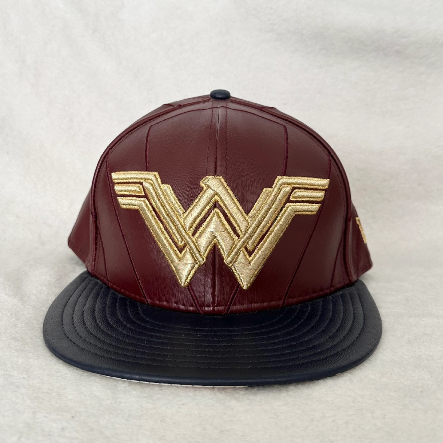 Here's an authentic New Era 59FIFTY fitted cap featuring Wonder Woman! It's a size 7 1/4 and has a unique design with a burgundy and black colour scheme.