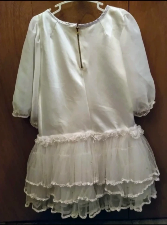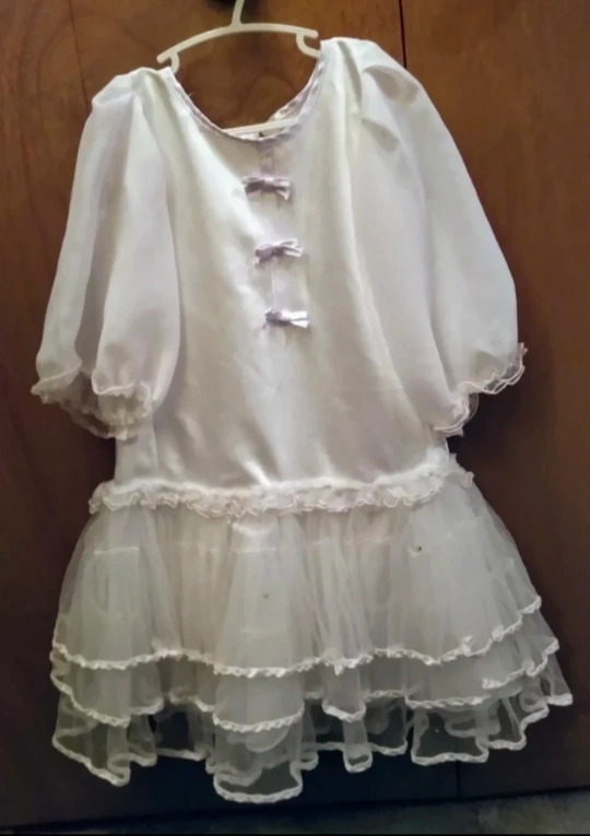 Girl's white satin dress with bows down the front and a frilly tulle skirt with satin edging. Would be suitable for a wedding (flower girl) or First Communion. Size 7/8.