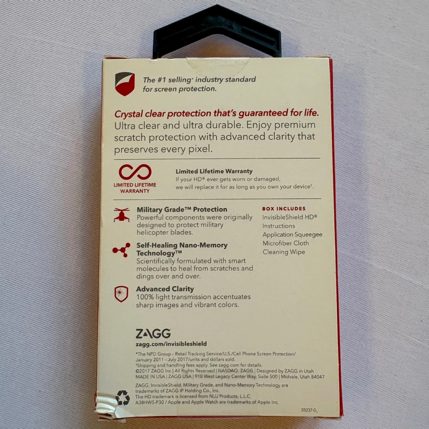 This is a Zagg Invisible Shield HD screen protector designed for Apple Watch 38 or 40 mm. It offers high-definition clarity and scratch protection. Keep your Apple Watch screen crystal clear with this durable screen protector. It's like giving your watch a superhero shield against everyday wear and tear.
