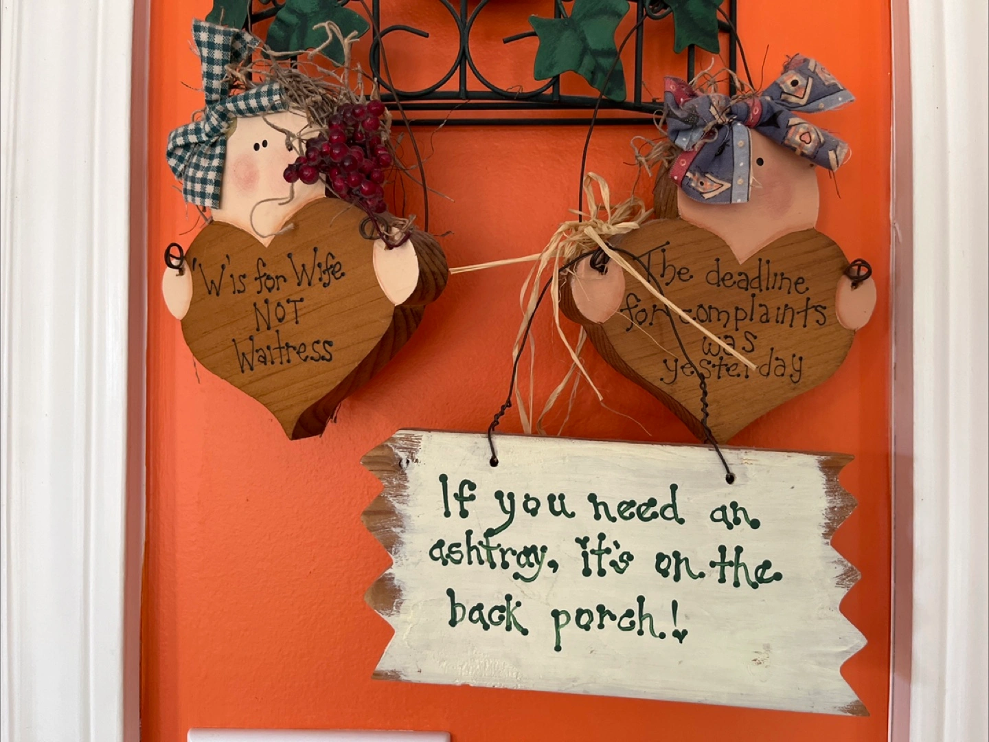I'm selling these handmade wooden signs. One says "W is for Wife NOT Waitress" and the other says "The deadline for complaints was yesterday". There's also a sign that says, "If you need an ashtray, it's on the back porch!" They're perfect for adding a bit of humour to your home decor! $5 each CASH only please.