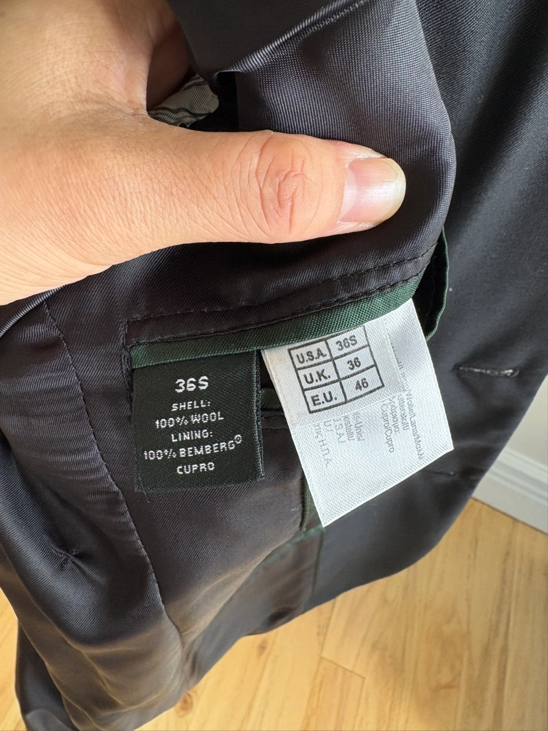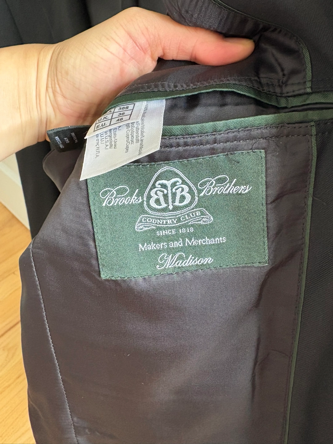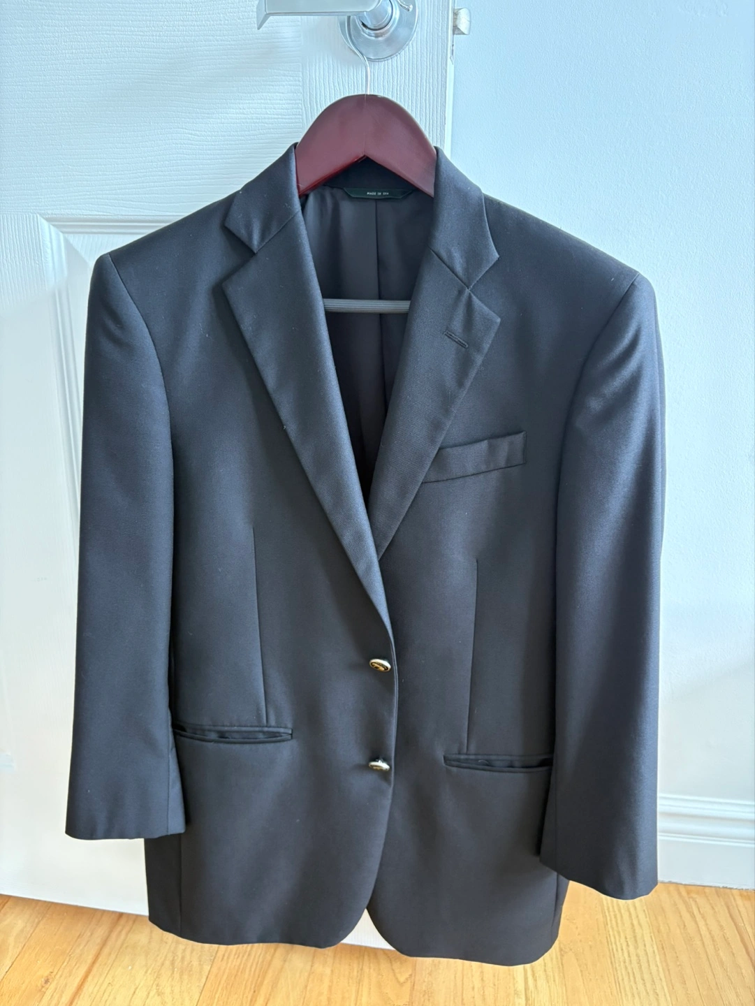 Selling a Brooks Brothers suit in size 36S. Black color. It's made in the USA and features a shell of 100% wool and a lining of 100% Bemberg.