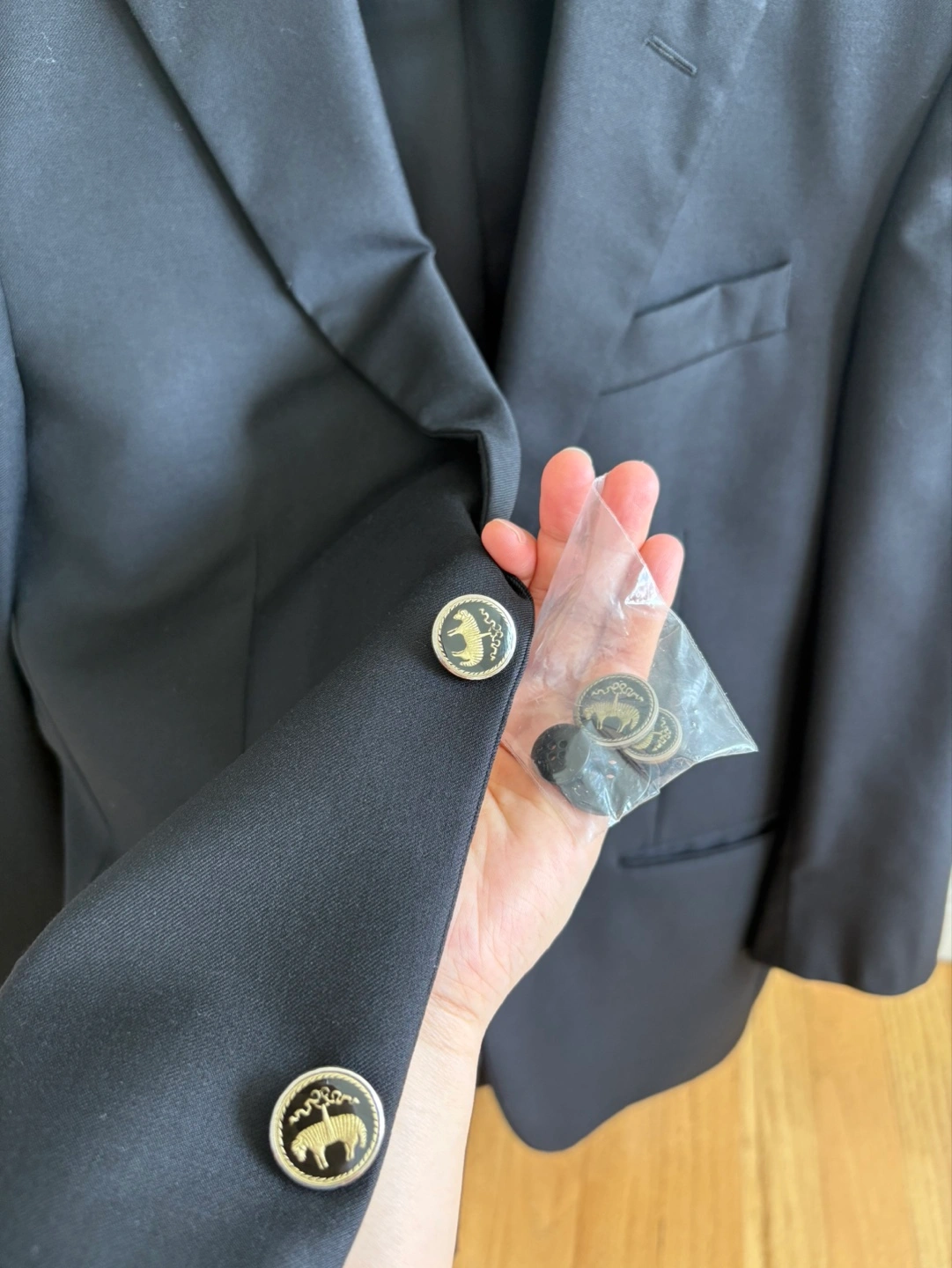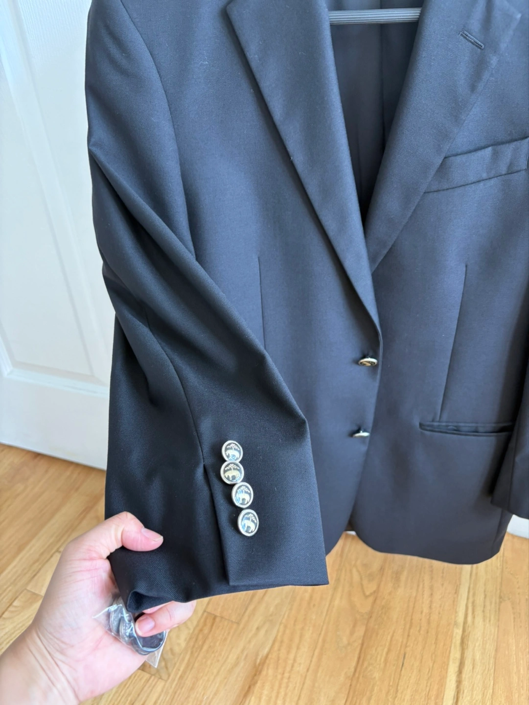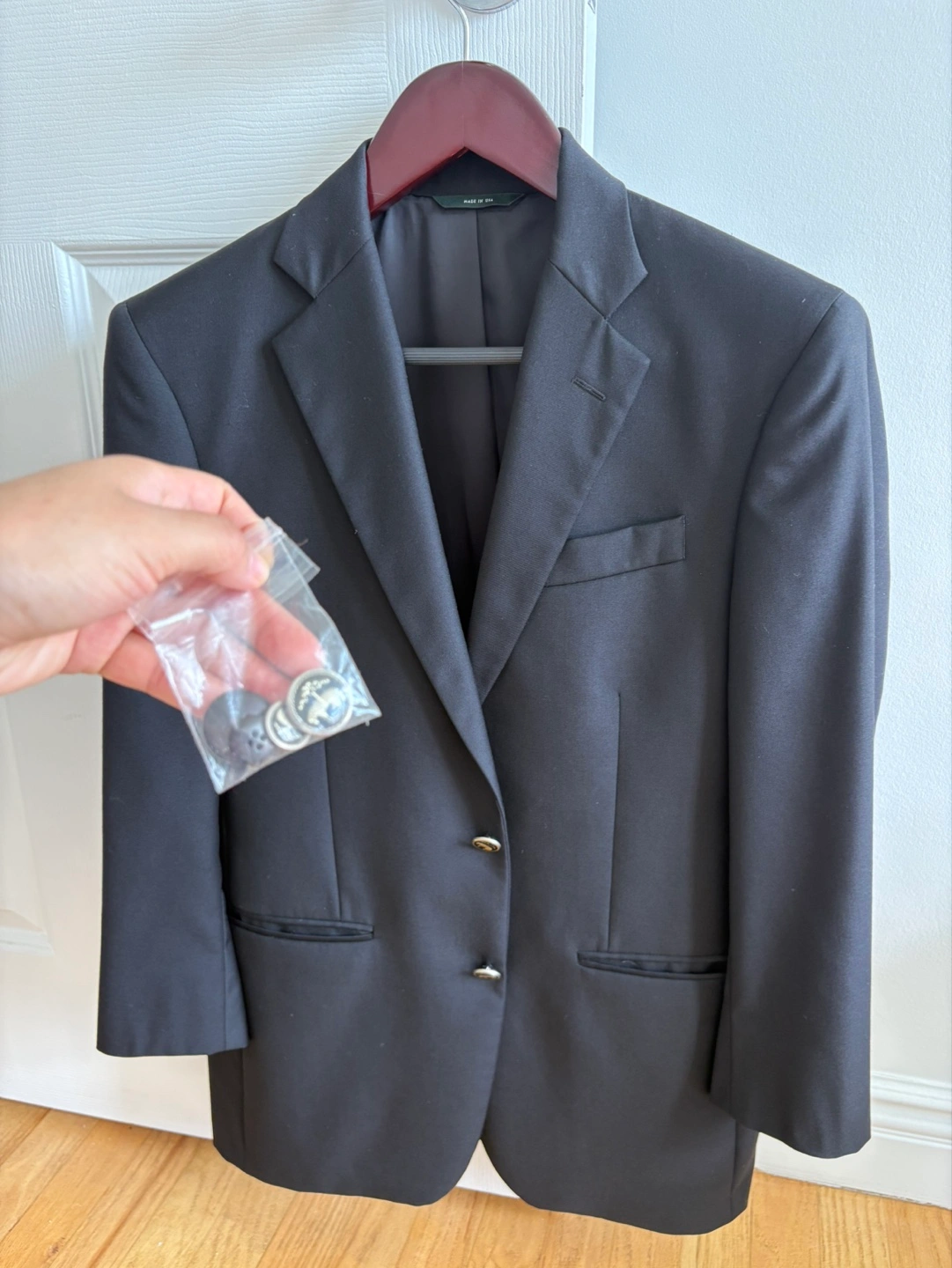 Selling a Brooks Brothers suit in size 36S. Black color. It's made in the USA and features a shell of 100% wool and a lining of 100% Bemberg.