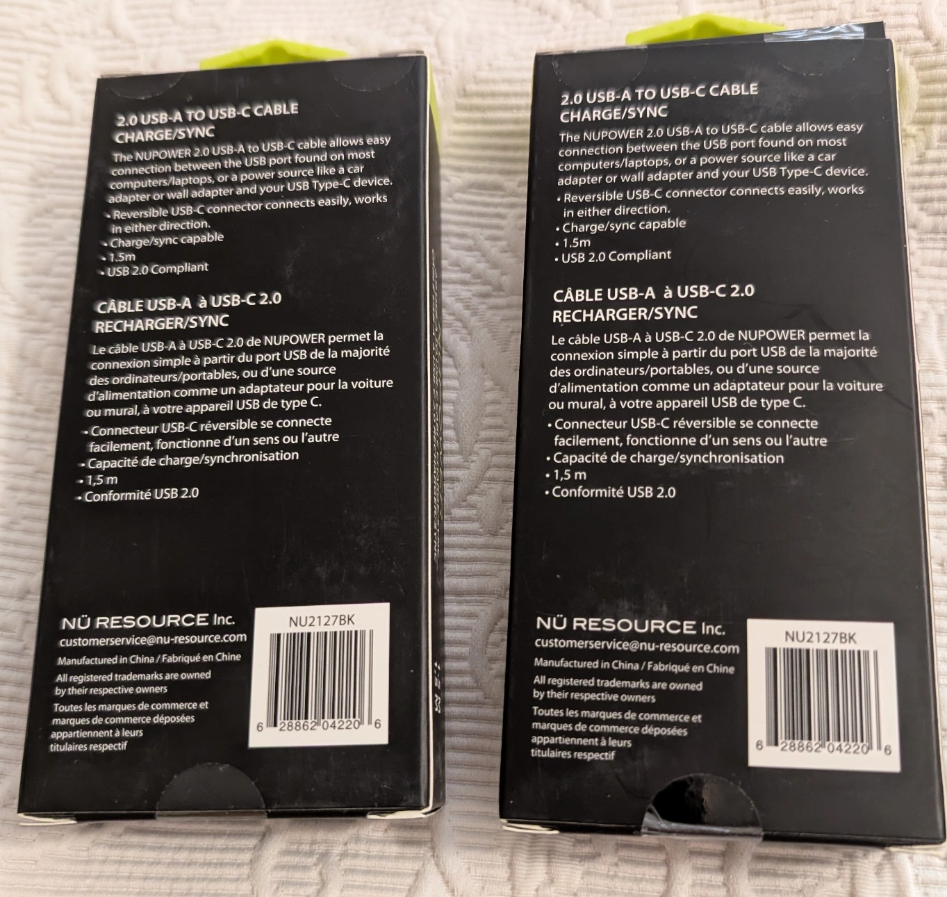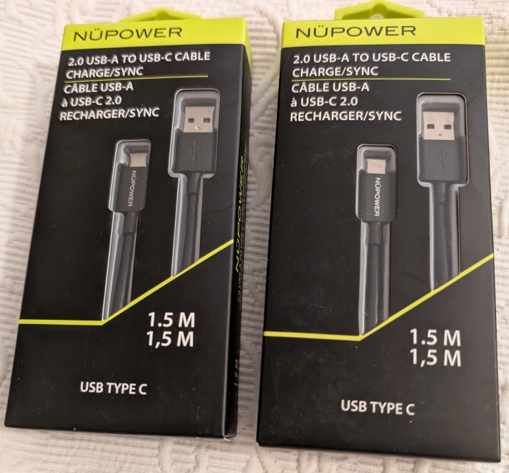 I'm selling two brand new NÜPOWER 2.0 USB-A to USB-C cable! It's 1.5 meters long and USB 2.0 compliant. The reversible USB-C connector connects easily, working in either direction. Perfect for charging or syncing your devices. Comes in the original box.