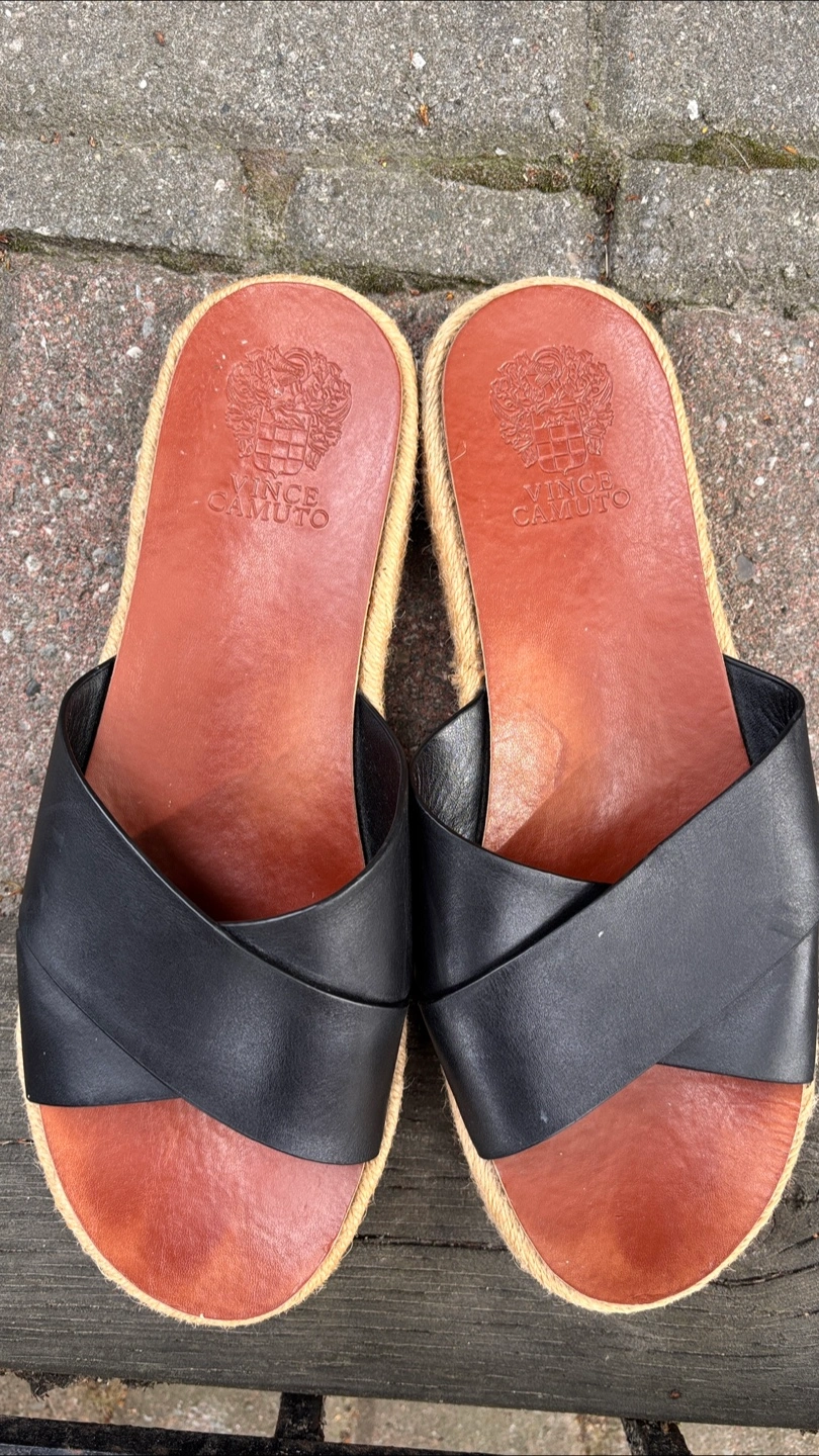 These Vince Camuto espadrille sandals are in great condition! Made from black leather upper and a comfortable espadrille platform.