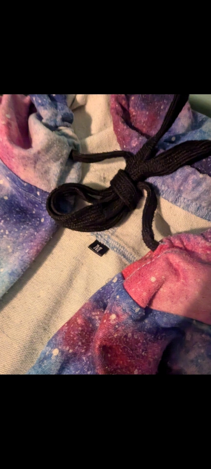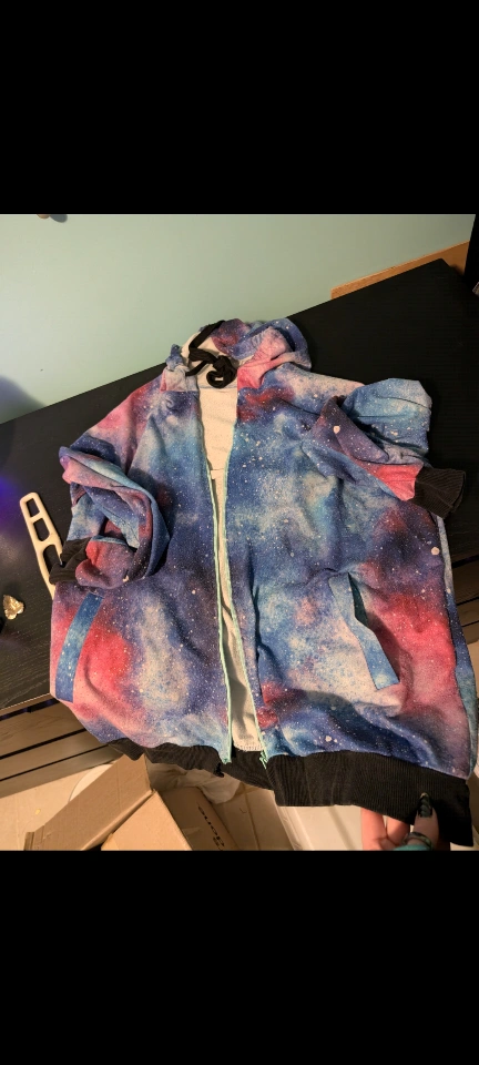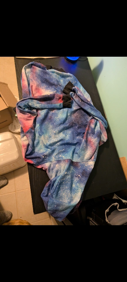 Galaxy print hoodie with pockets in size medium. The hoodie features a cool galaxy design with shades of blue, pink, and white. From home with dogs. North Center (Chicago) near Damen & Montrose