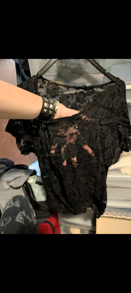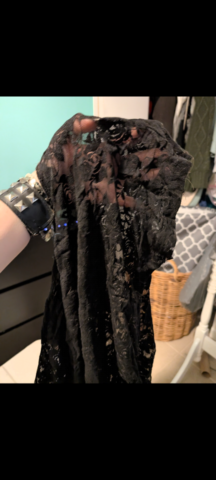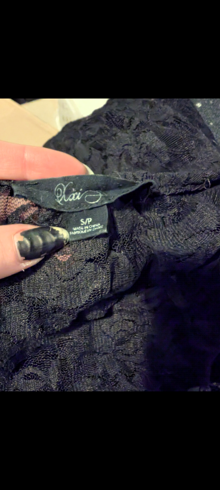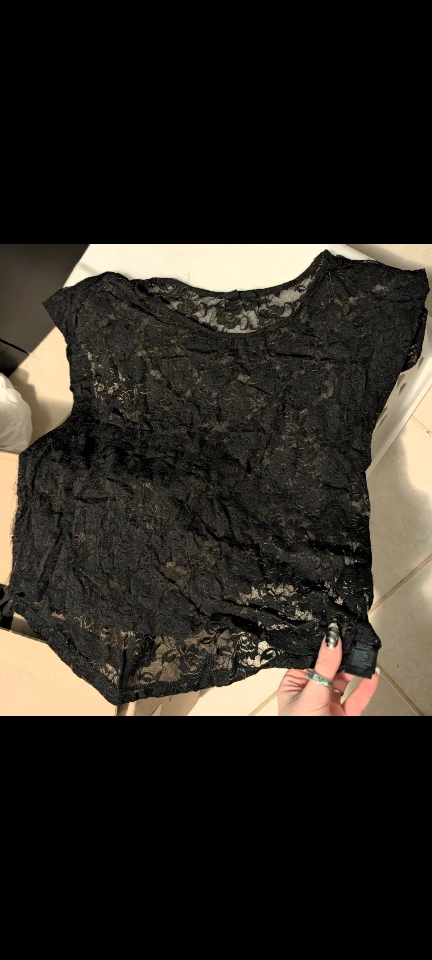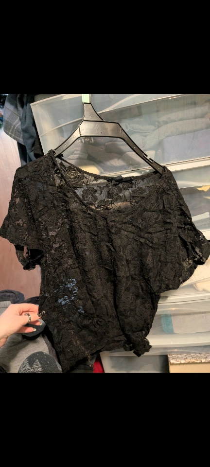 Cute black lace top from Xai brand, size S/P. Perfect for layering or wearing on its own. From home with dogs. North Center (Chicago) near Damen & Montrose