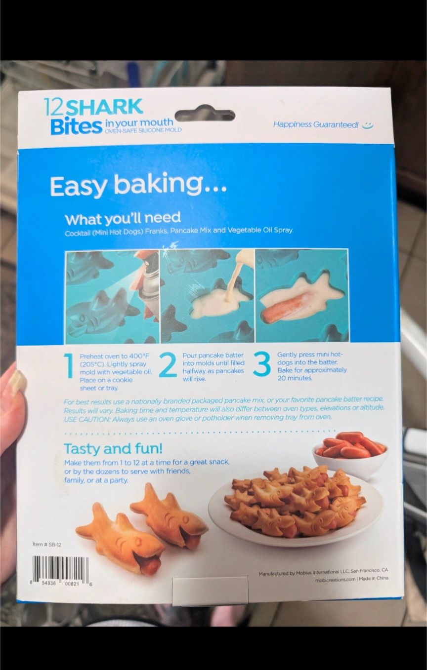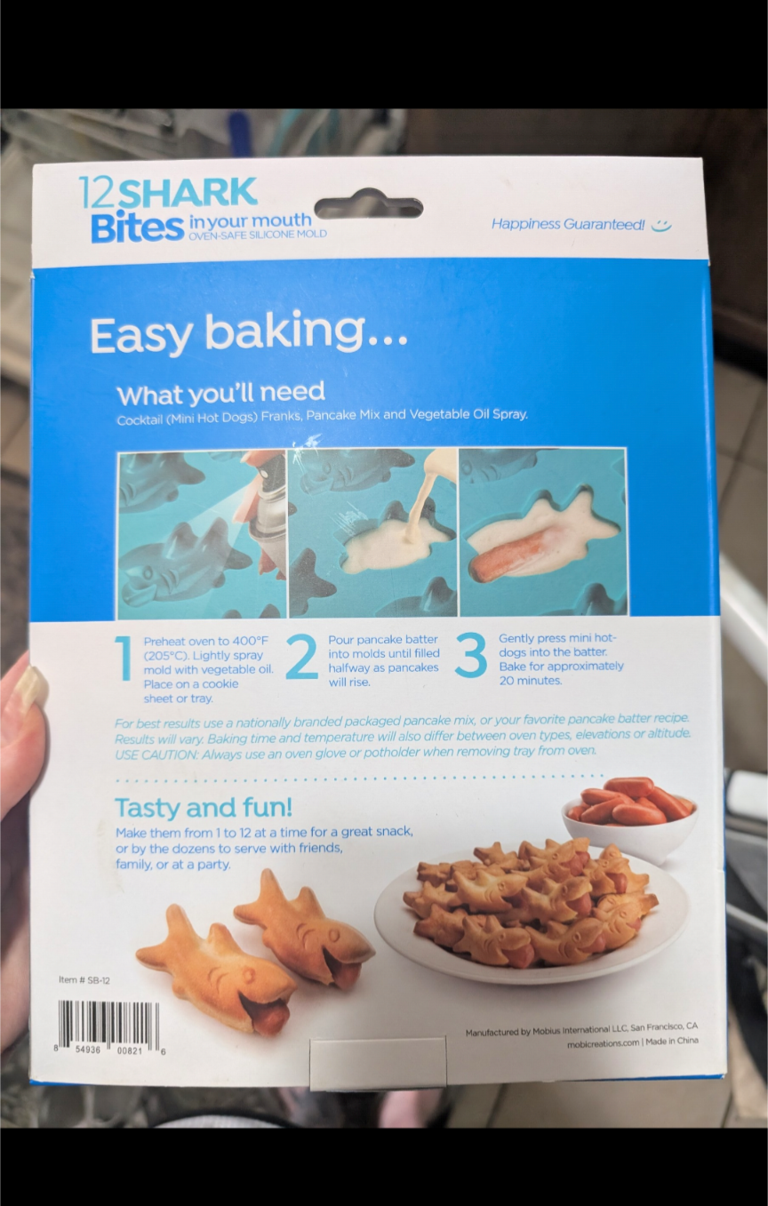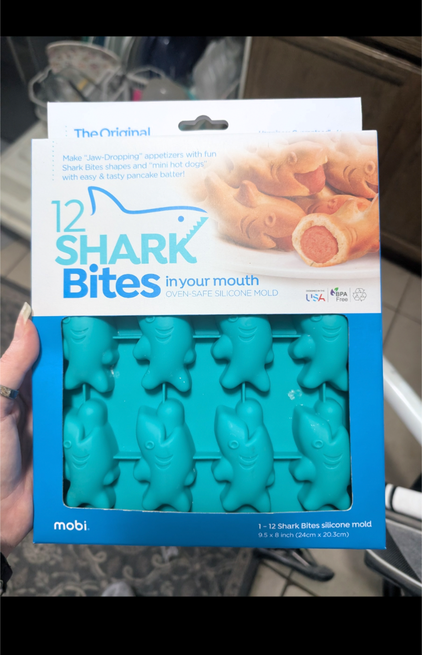 Make fun, jaw-dropping appetizers with the Mobi Shark Bites oven-safe silicone mold! This mold creates 12 shark-shaped bites perfect for mini hot dogs with pancake batter, or other mini snacks. It's easy to use and makes for a tasty and fun treat for friends and family. It's made from premium, BPA-free, food-grade silicone, is nonstick for easy food removal, and is dishwasher safe for easy cleaning. Simply use mini franks and your preferred pancake mix (or other dough), bake, and enjoy! The mold measures 9.5 x 8 inches (24cm x 20.3cm).
