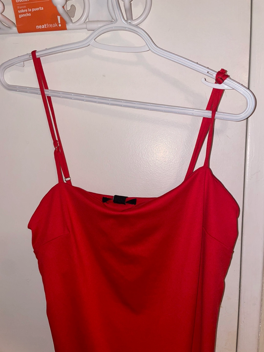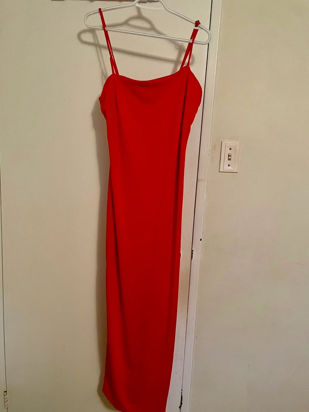 Selling a vibrant red maxi dress with spaghetti straps and a slit at the back! It's in great condition, never worn, and perfect for a night out or a special occasion