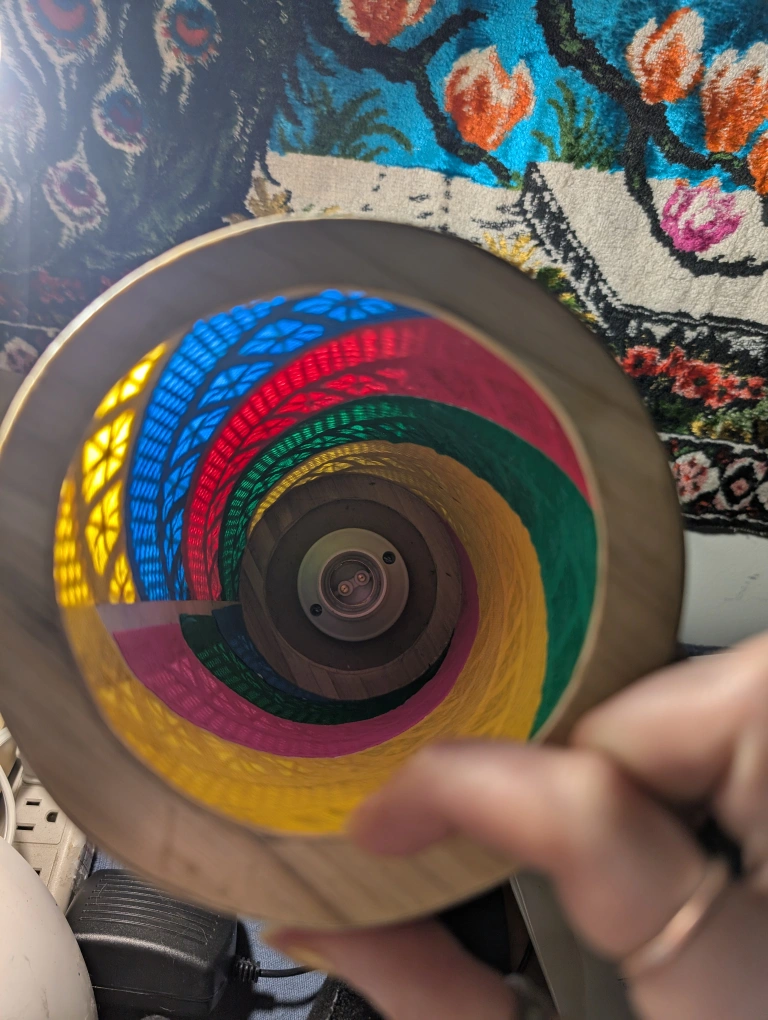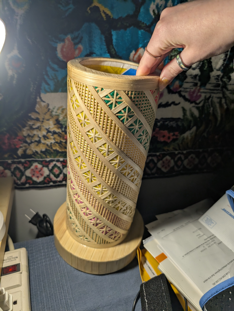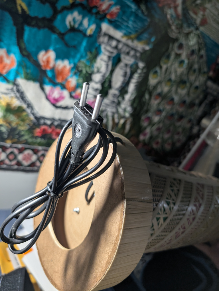Beautiful bamboo table lamp creates a warm and inviting ambiance. It features a unique geometric pattern made by artisans in Bangladesh. It has a corded plug and connection for a bulb, but keep in mind that as an imported item, it is not compatible with American connections. You can easily place a battery light inside, or enjoy the colors sans illumination.