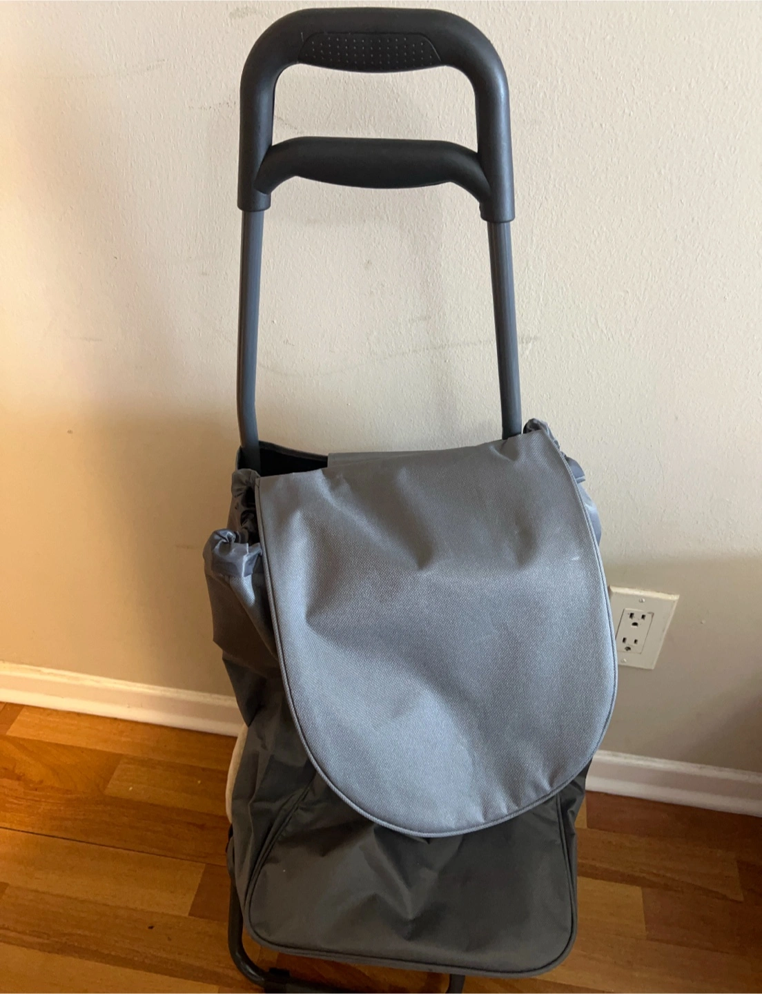 Selling a grey shopping cart trolley. It's in great shape and ready to help with your grocery runs or trips to the market! It features a sturdy handle and a spacious bag, making it super convenient.