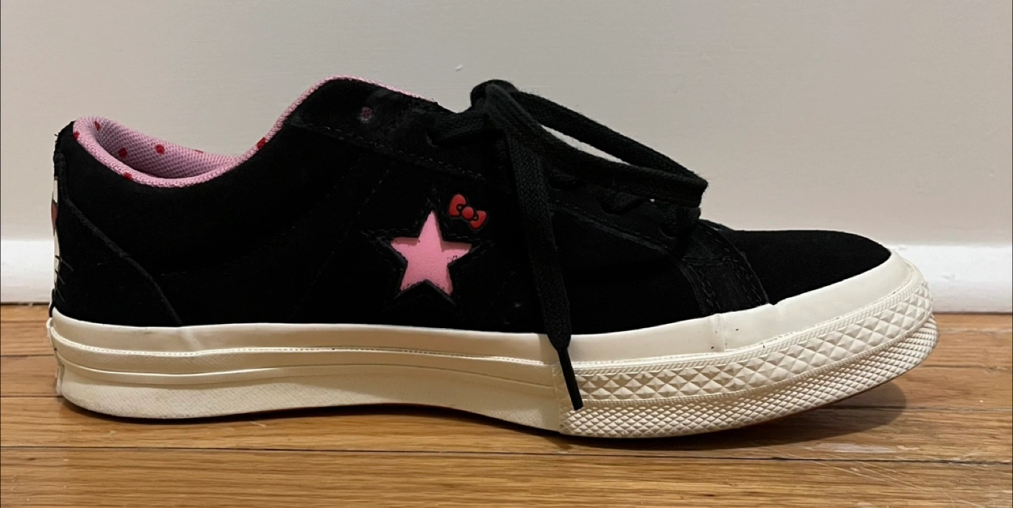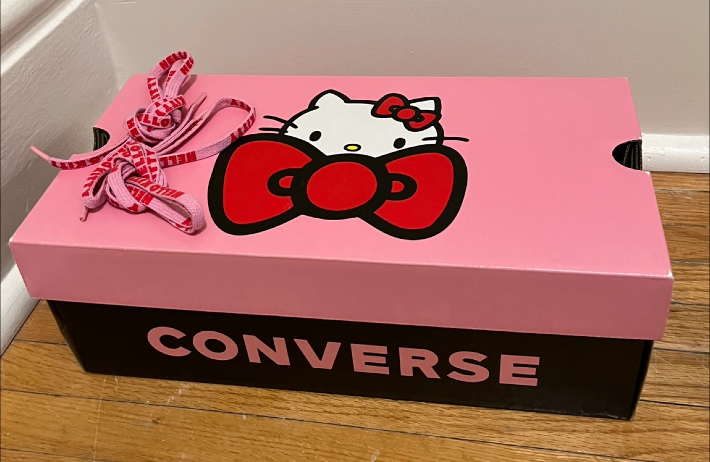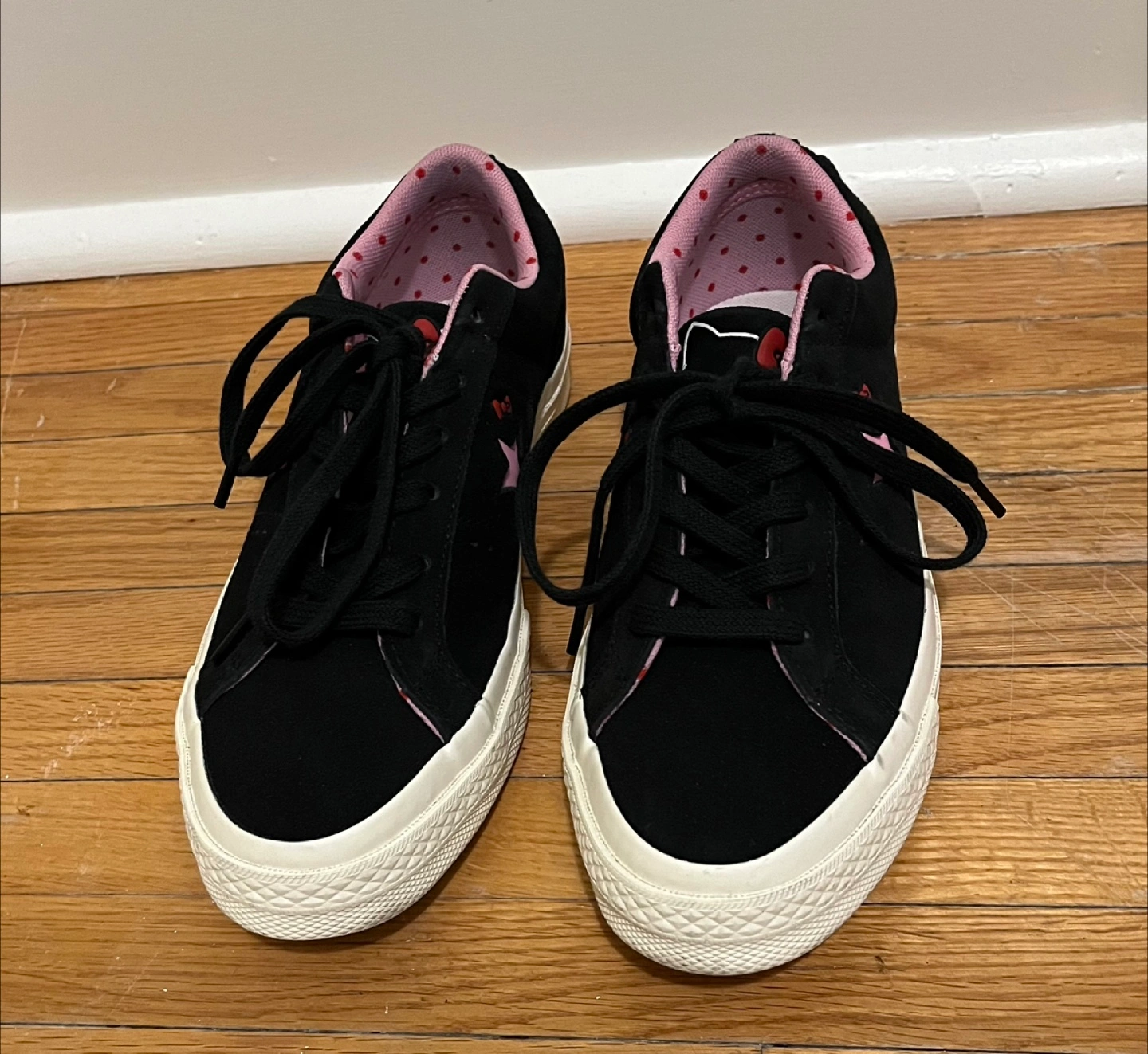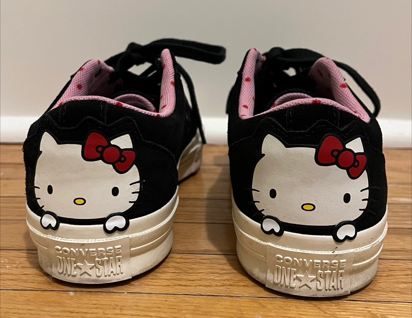 These are a pair of Converse One Star sneakers with a Hello Kitty design! They are black with a pink star and Hello Kitty details. The shoes come with their original box and an extra pair of pink laces.